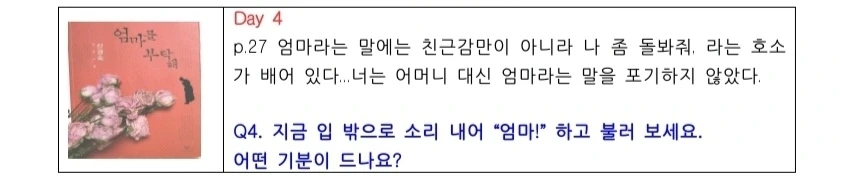 이여사는 씬디가 전해 드린 플래그를 알록달록 붙이며 책을 읽으셨단다. 슬쩍 들쳐 보아도 곳곳에 형광펜 밑줄이 가득하다. 씬디는 책을 잠시 옆으로 치워두며 말한다. “엄마, 나 배고파. 먹을 거 없어?”