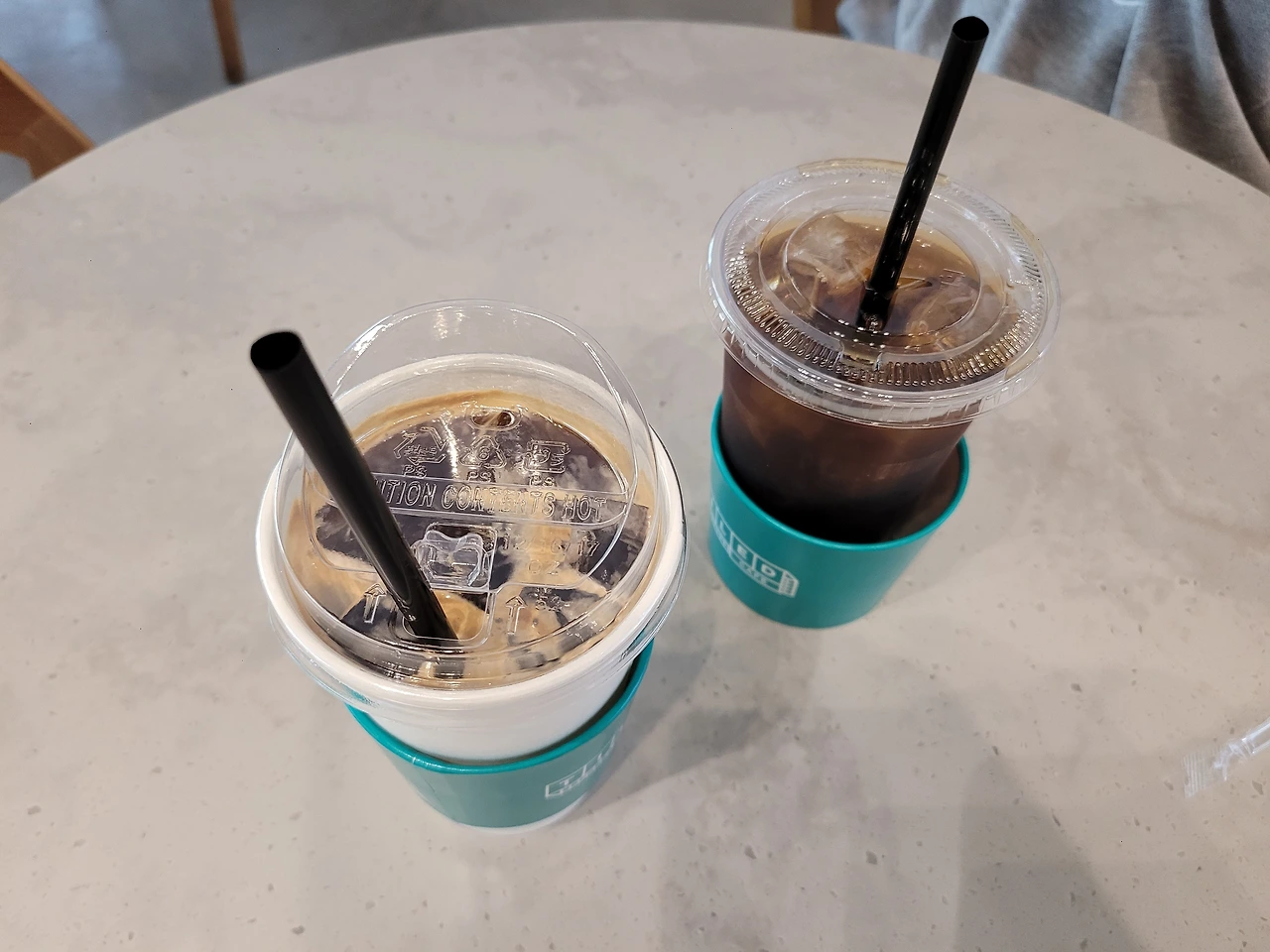 기아자동차 전시장이 있었고 1층 카페가 '타일드 카페'였는데 마침 콜드브루가 3천원이라는 팝업 안내문이 전시장 앞에 붙어 있어서 밖에서 보기에도 넓고 자리도 많아 보여서 우리는 타일드 카페로 들어가서 C는 콜드브루를 저는 아이스 아메리카노를 주문하고 1층 정원쪽에 자동차 전시되어 있는 것도 보고 커피를 마시며 이런 저런 대화를 나누었어요.