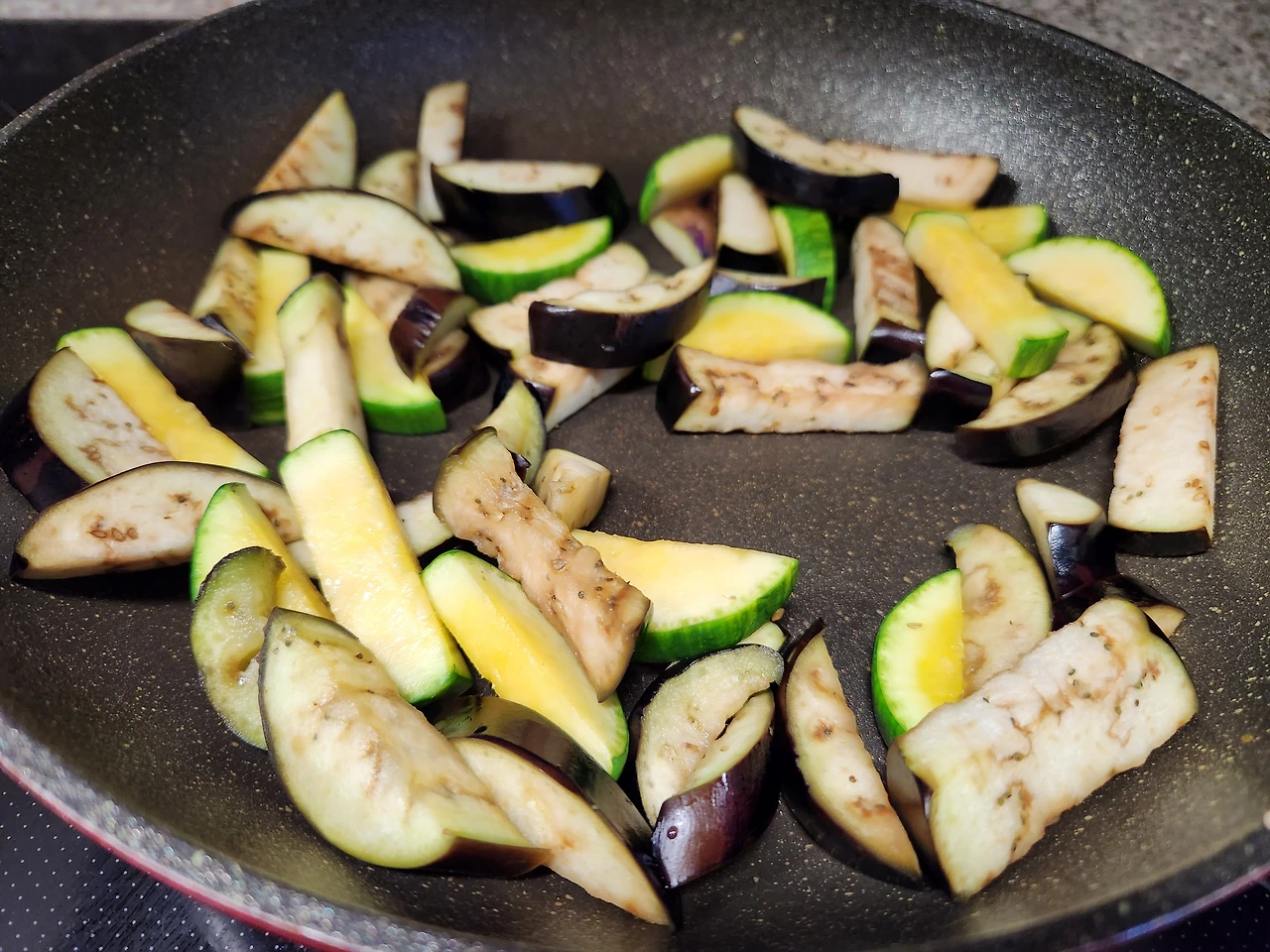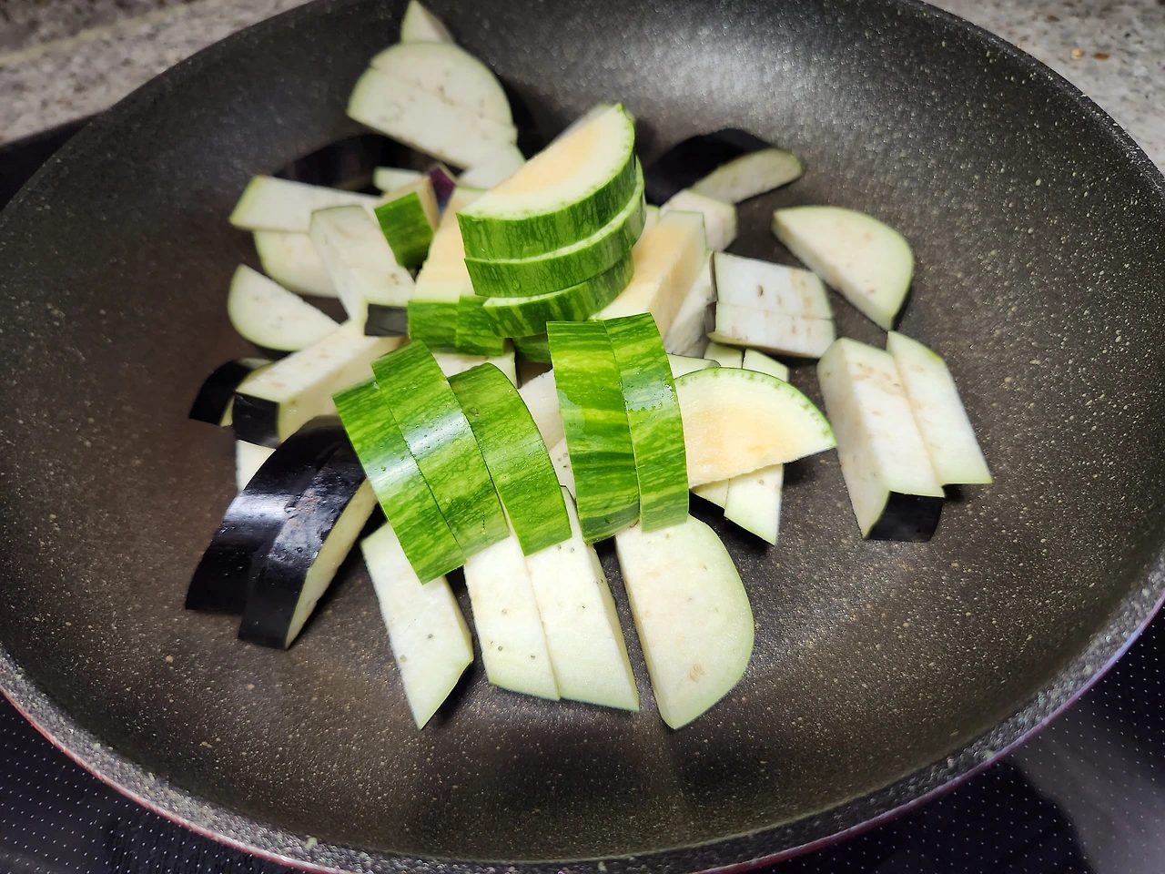 2. 중불 예열한 마른 팬에 가지, 애호박을 타지 않게 뒤집어 가며 구워준다.(가지, 애호박을 볶아 넣어주면 흐물거림이 적고 식감이 살아있다.)