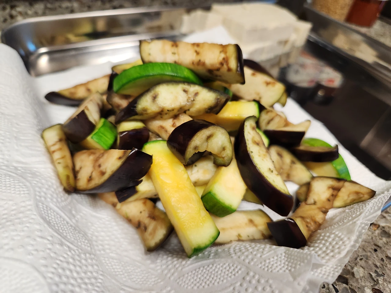 3. 노릇하게 구워진 가지, 애호박을 키친타월 위에 올려 남은 수분을 제거해 준다.