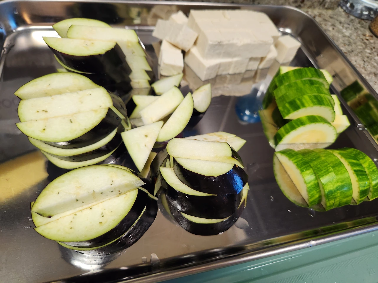 1. 가지, 애호박을 깨끗이 씻어 가지는 편 썰고 애호박은 반달 썰기, 두부는 한 입 크기로 잘라준다.