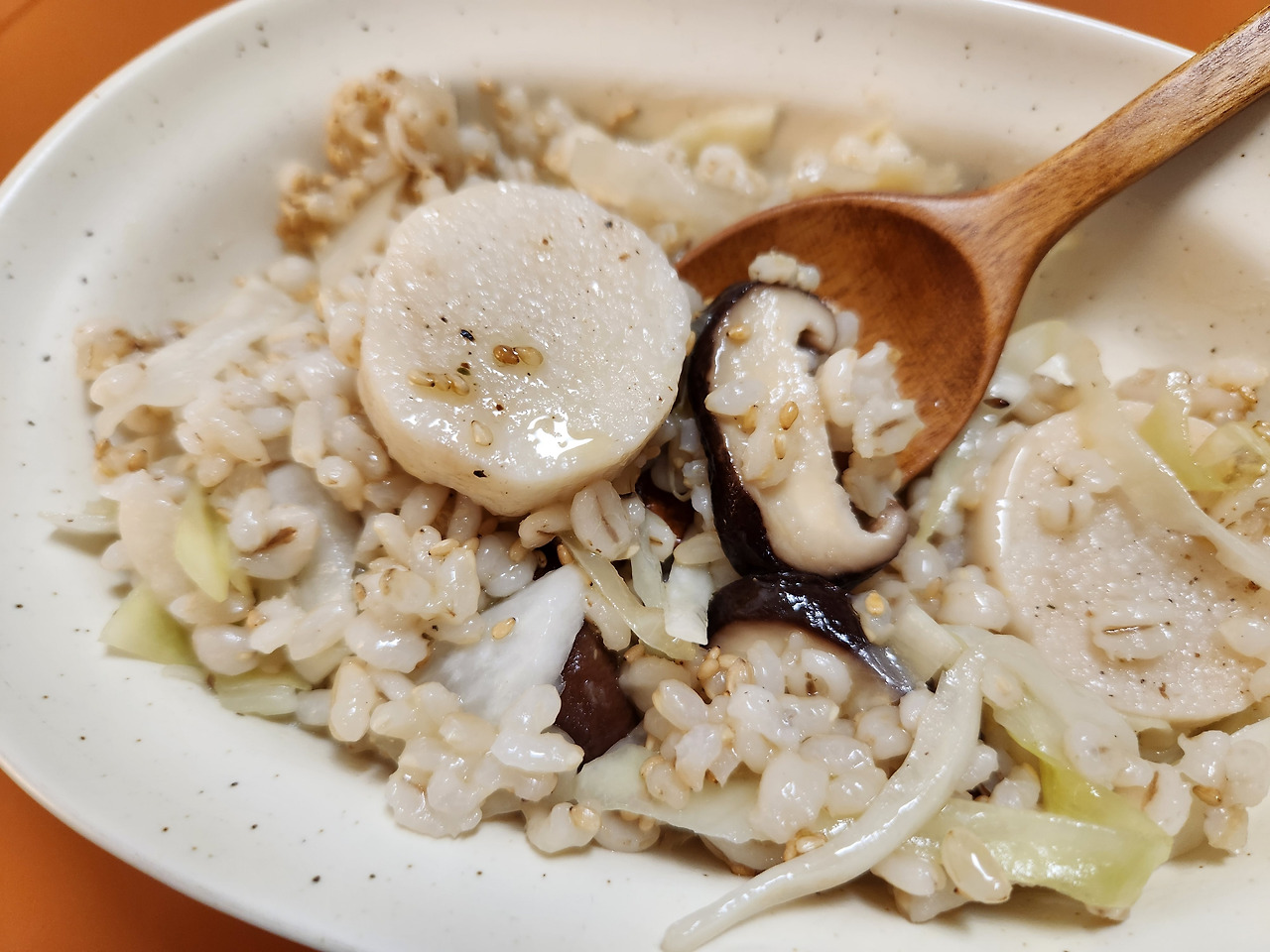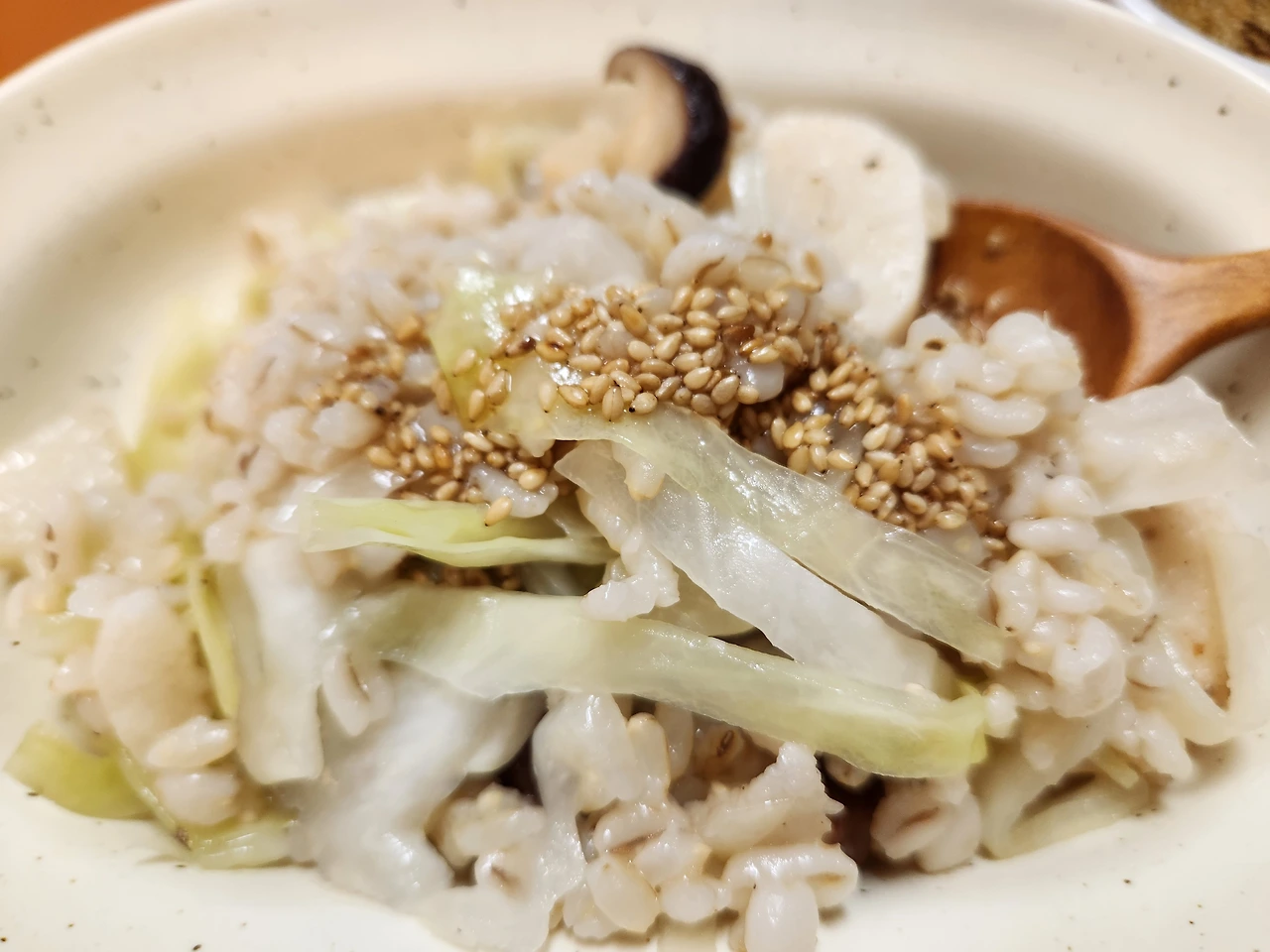 10. 마 버섯 양배추 솥밥 완성이다. 들기름 양념장을 만들어 곁들여 먹으면 더 맛있다.