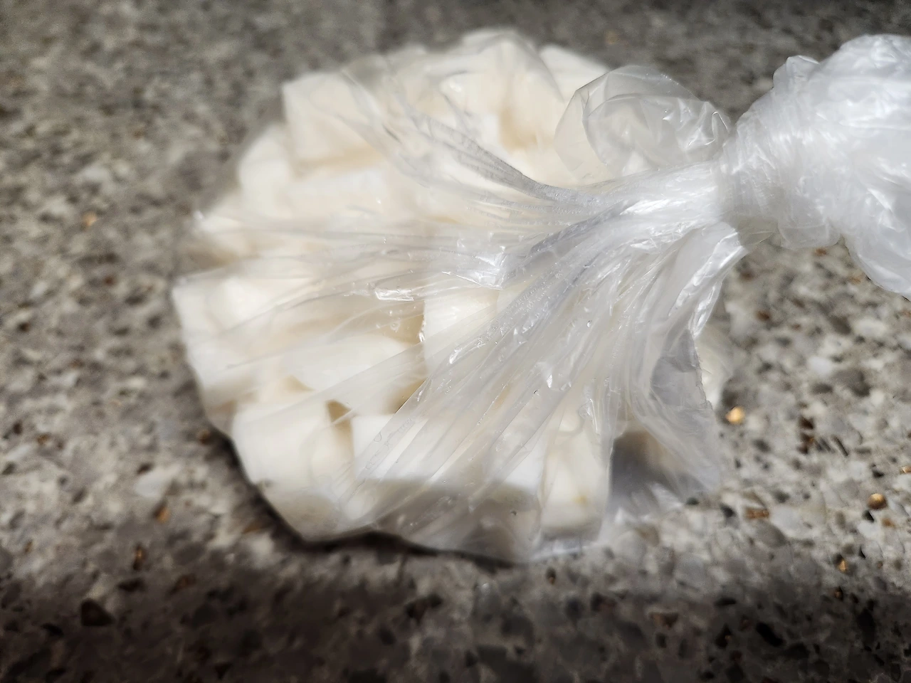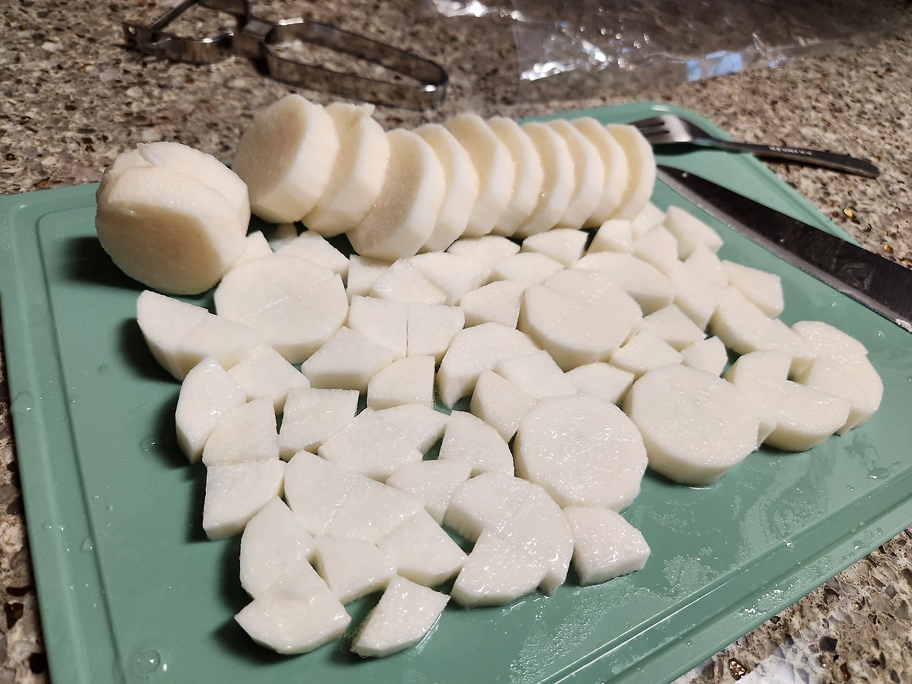 2. 장갑 끼고 필러로 마 껍질 제거 후 절반은 1cm 편 썰기, 반은 큐브로 잘라준다.(보통 2개씩 묶음으로 파는데 한꺼번에 손질 후 남은 건 3일 내는 냉장고, 일주일 이상은 냉동보관 한다.)