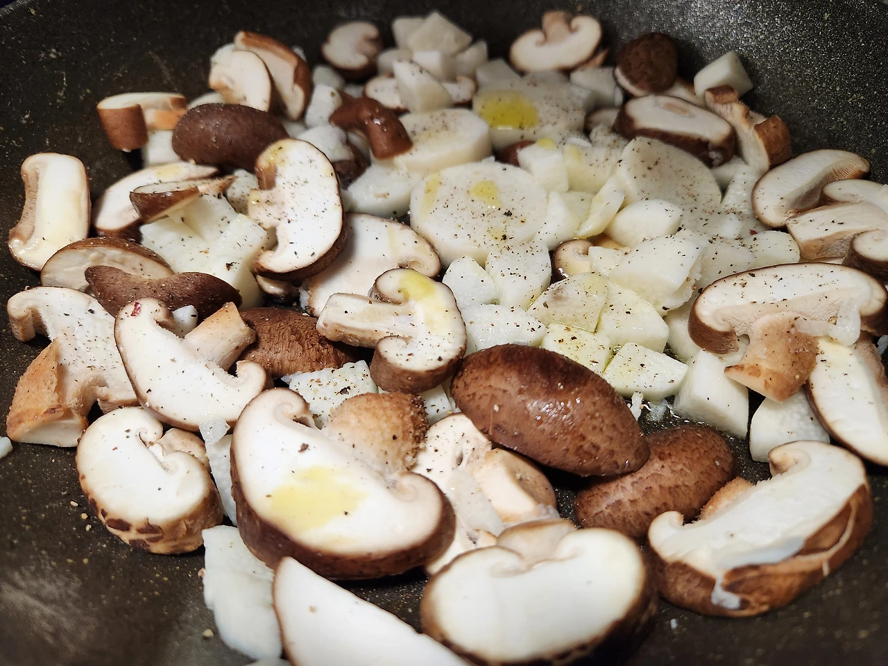 7. 중불에 미니 표고와 올리브오일 1T, 소금, 후추를 뿌려 버섯 향이 솔솔 날 때까지 볶아준다.