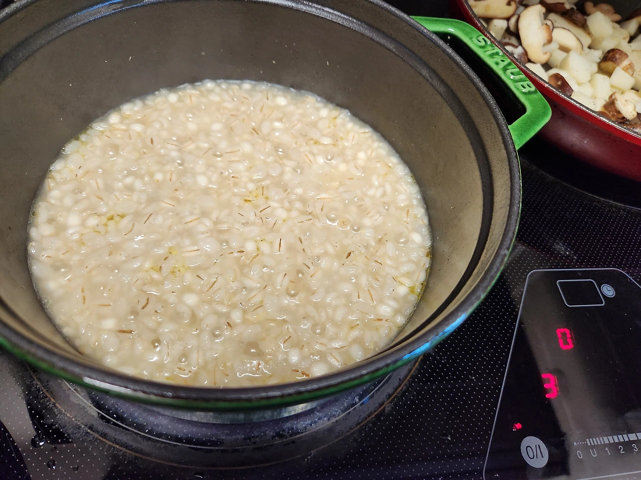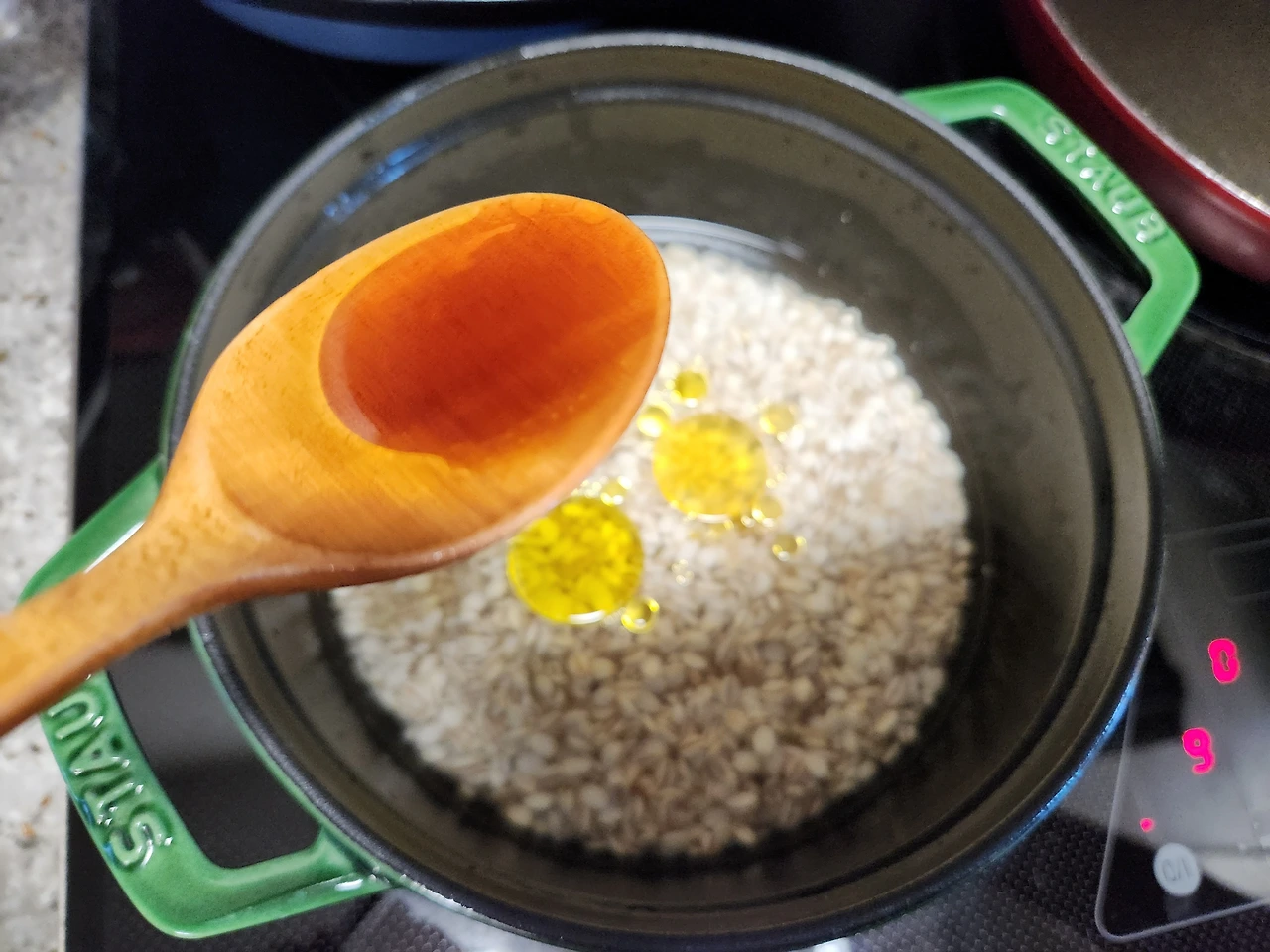 5. 밥 물에 올리브오일 1T, 들기름 1T, 국간장 1/2T를 넣어 밑간을 하고 뚜껑 닫아 강불에 5분 끓인다.