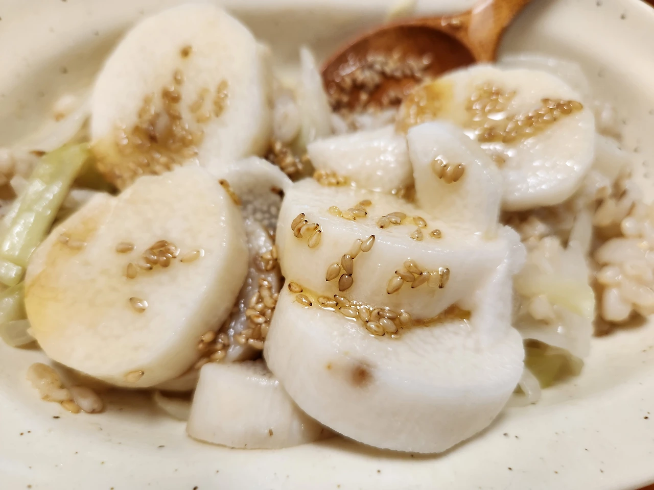 생마도 잘 먹는다면 생마 몇 조각을 빼두고 들기름 양념장에 함께 비벼 식감을 비교하며 먹어도 좋다.