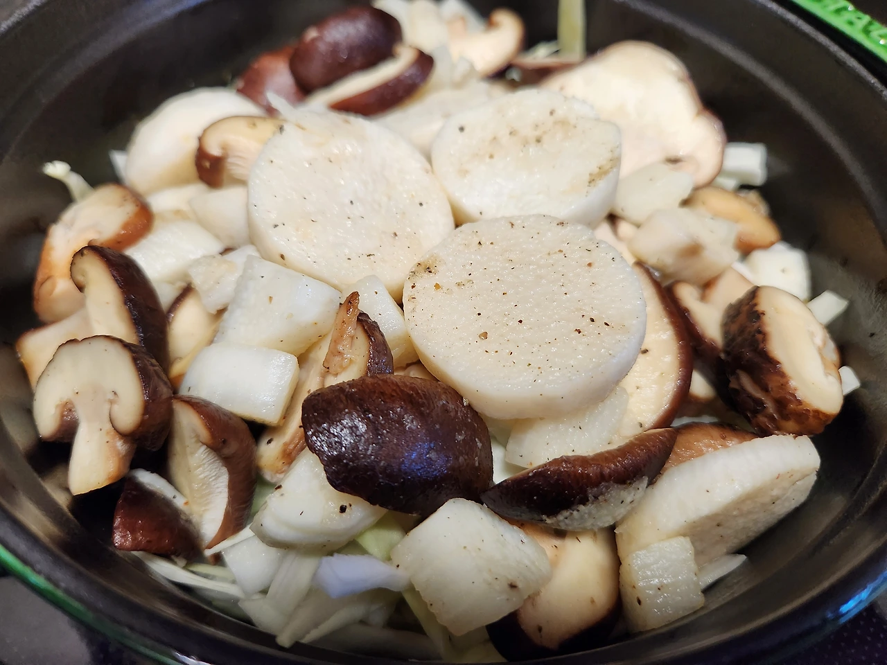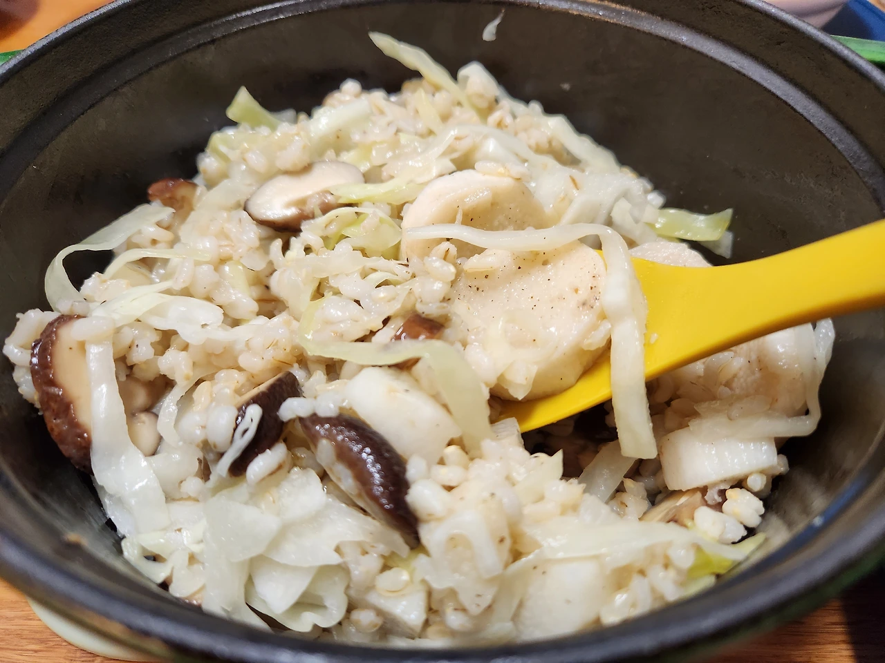 9. 밥 위에 양배추를 깔고 마와 버섯을 올린 후 약불에 5분 끓이고 불 끄고 5분 뜸 들인다.