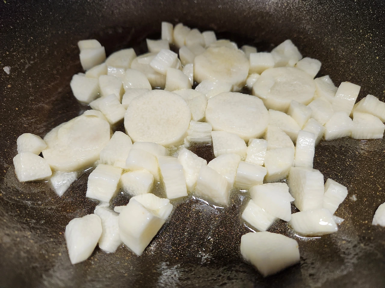 6. 중불에 들기름 1T와 마를 넣고 1분 내로 볶아준다.(마는 열을 오래 가하면 영양소가 파괴된다.)