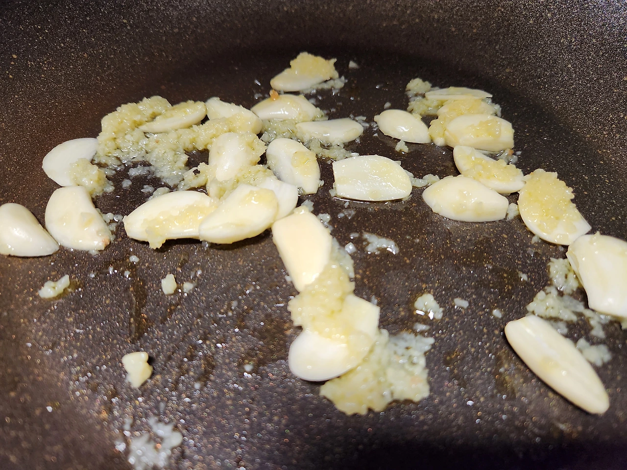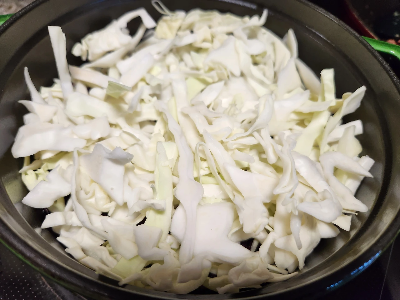 2. 마늘, 양배추를 흐르는 물에 헹궈준다. 마늘은 꼭지 제거 후 편 썰고 양배추는 두 줌 정도 채 썰어 준비한다.