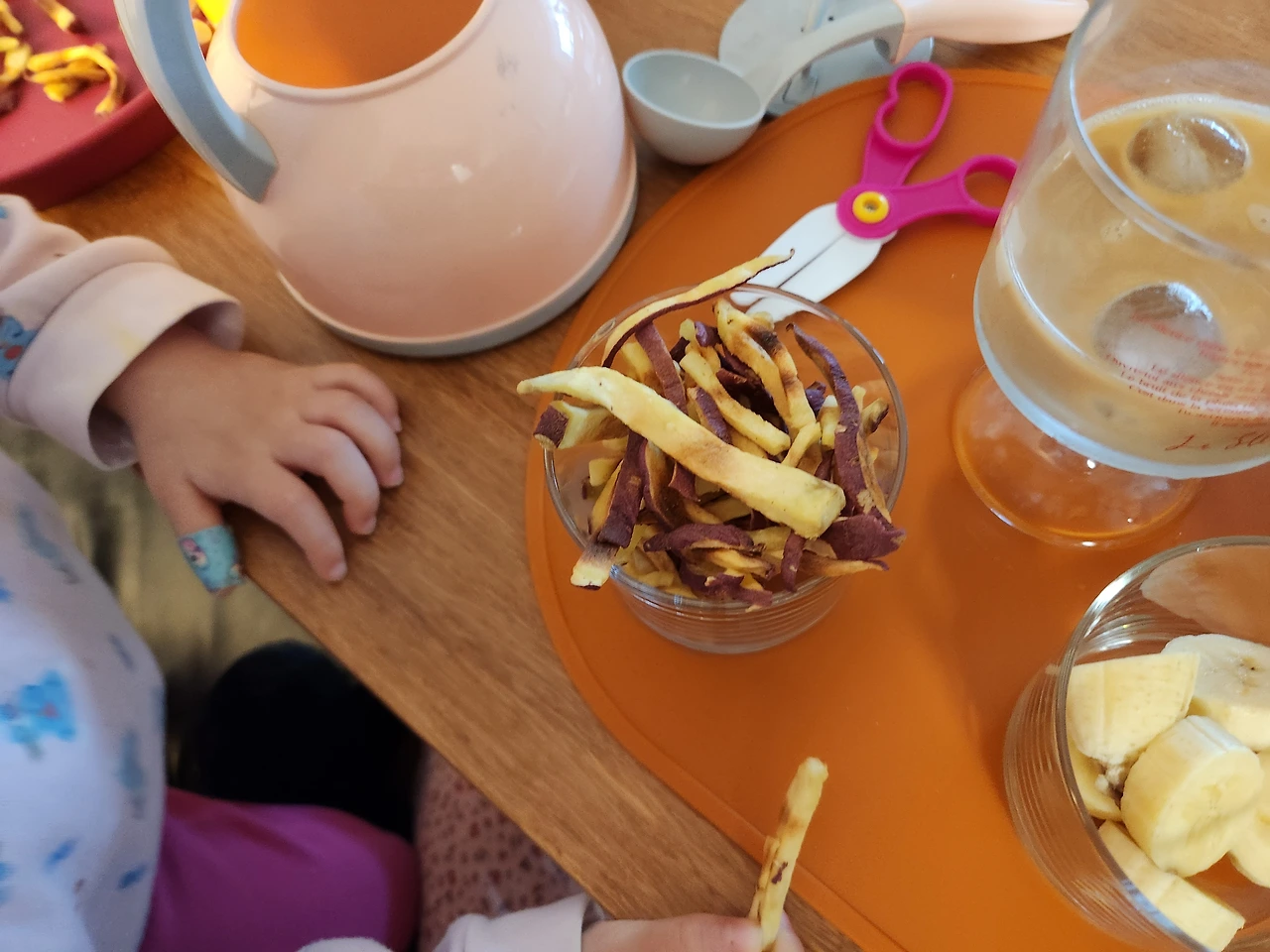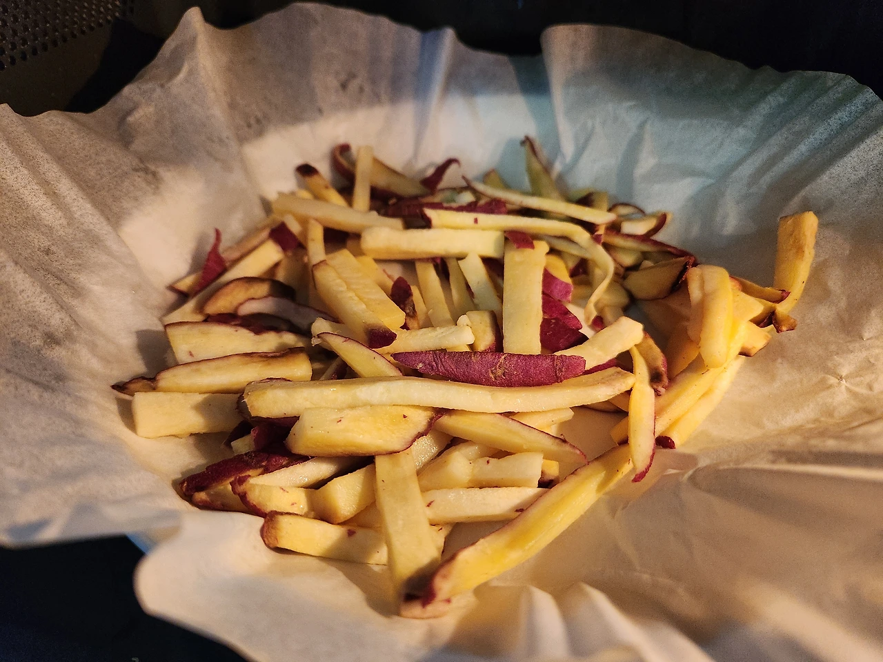 1. 고구마 1~2개를 채 썬다. 2. 위생팩에 채 썬 고구마, 현미유 1T를 넣고 섞어준다. 3. 쟁반에 종이호일을 깔고 고구마를 얹은 후 전자레인지 15분 조리한다.(5분, 5분, 3분, 2분) *종이호일 밑에 고인 수분을 닦아가며 4회에 나누어 조리한다.
