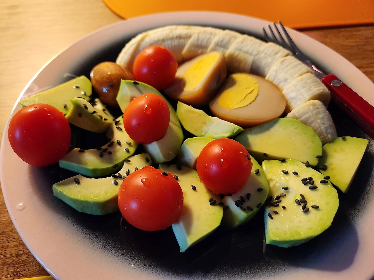 아보카도 1개, 바나나 1개, 계란 1개, 방울토마토 5알