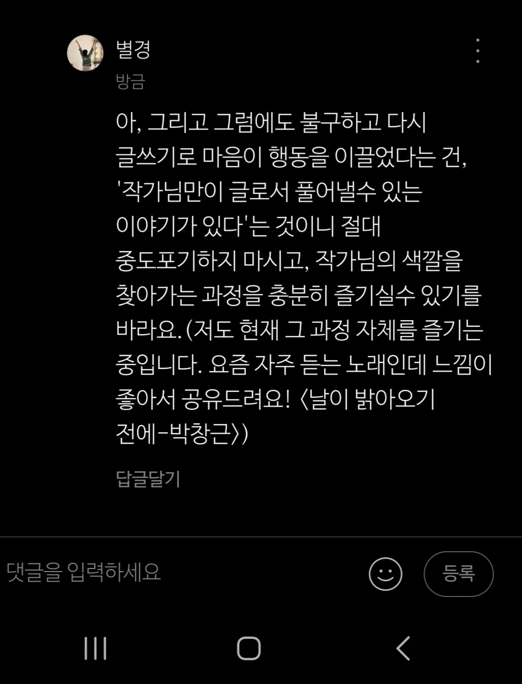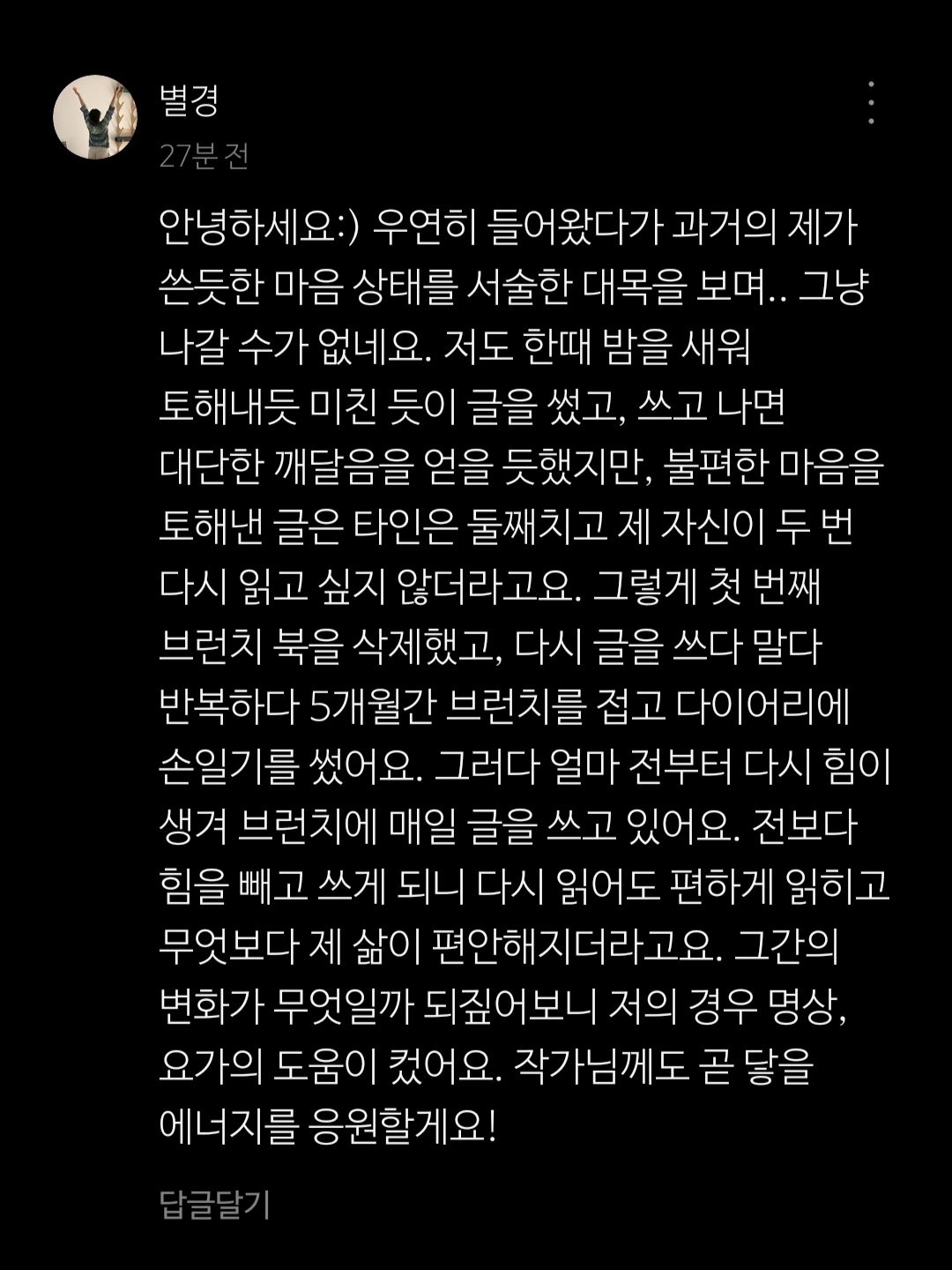 좋아요를 따라 들어간 글을 클릭하고 읽어 내려가다가, 과거의 내가 쓴 글인 줄 알았다. 내 마음을 훑어 내린 감정이 서술되어 있는 것을 모른 체할 수 없는 마음으로 오지랖 넓게 댓글을 남겼다. 내가 쓴 댓글을 읽다가 그때의 나에게도 들려주고 싶었다. 어쩔 줄 모르며 방황 중이던 과거의 나에게, 그리고 앞으로도 언제든 다시 찾아올 수 있는 나에게.