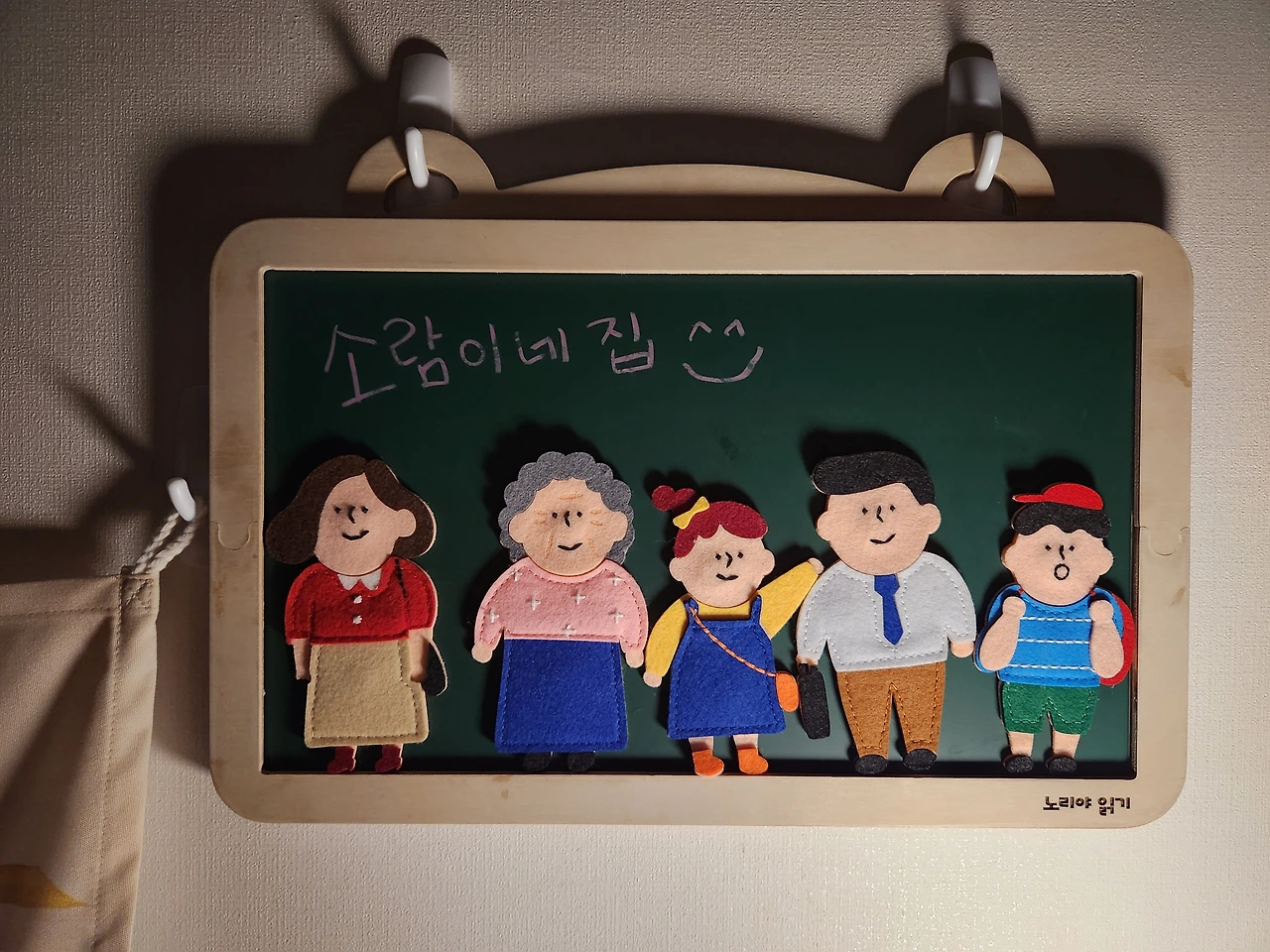 오늘이 새로운 서툰 엄마인 나는, 기껏 엉덩이 씻기고 양치시키고 로션 발라 옷을 입혔더니 "잠깐만"하고는 자신 옆에 있는 엄마인형을 할머니인형 자리와 바꿔 버린다. 감정변화가 있을 때마다 표현하는 인형칠판이다.