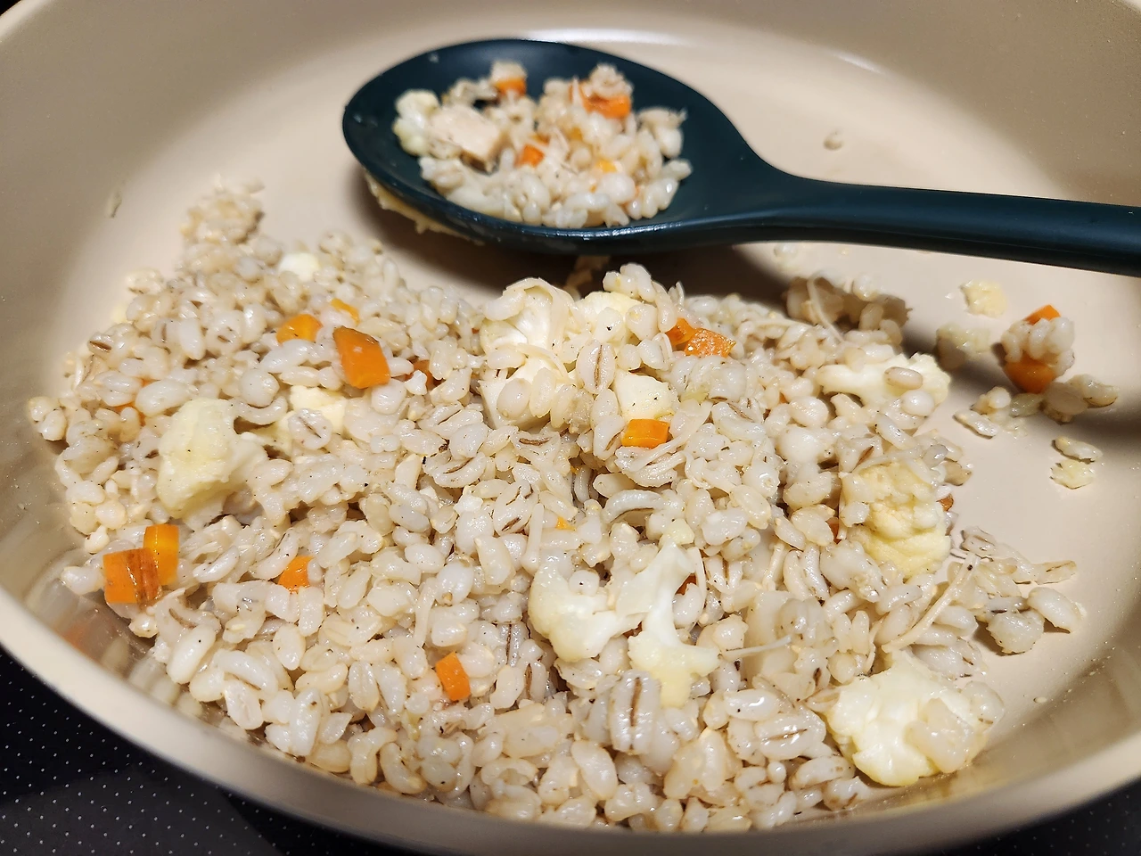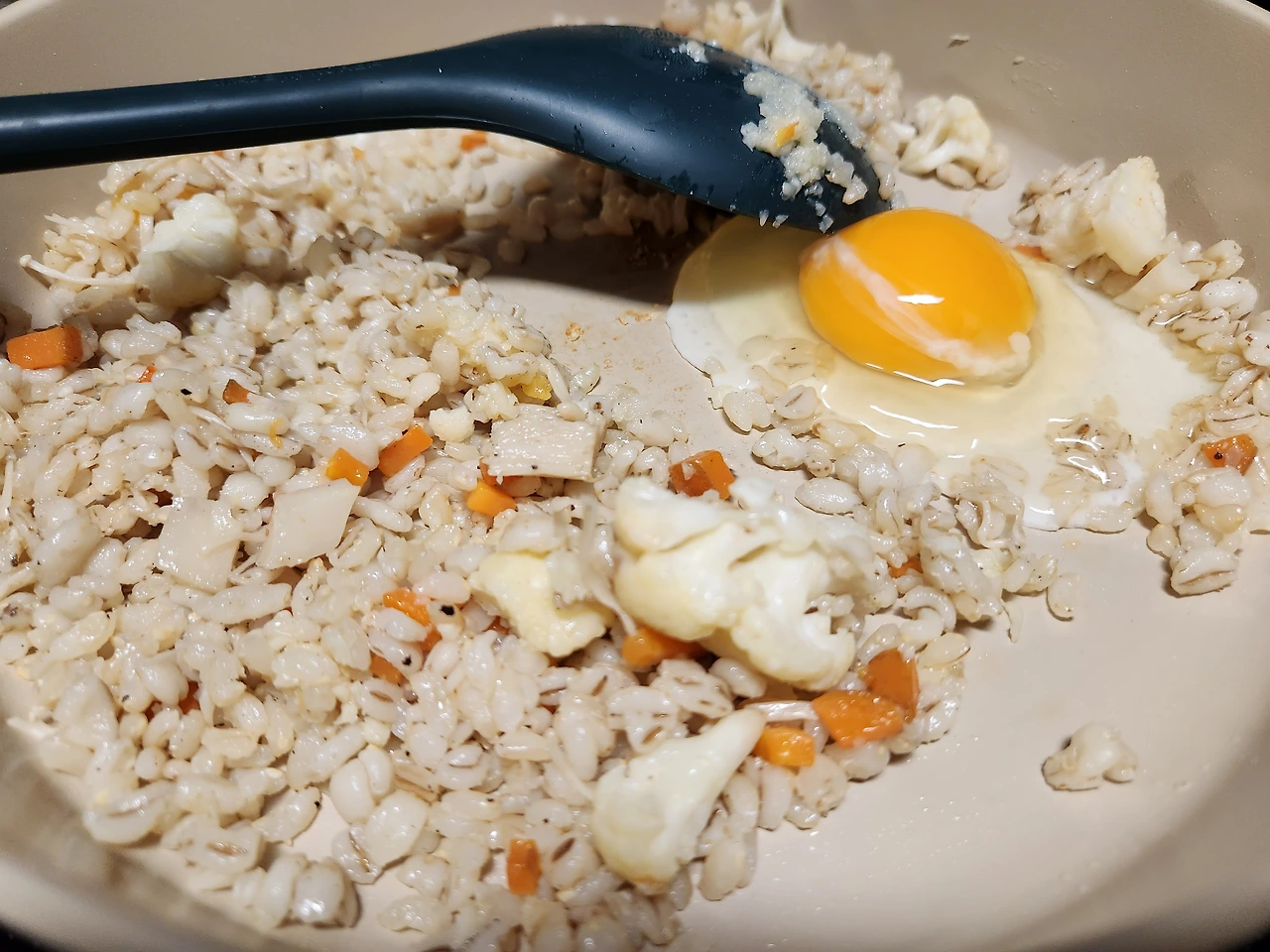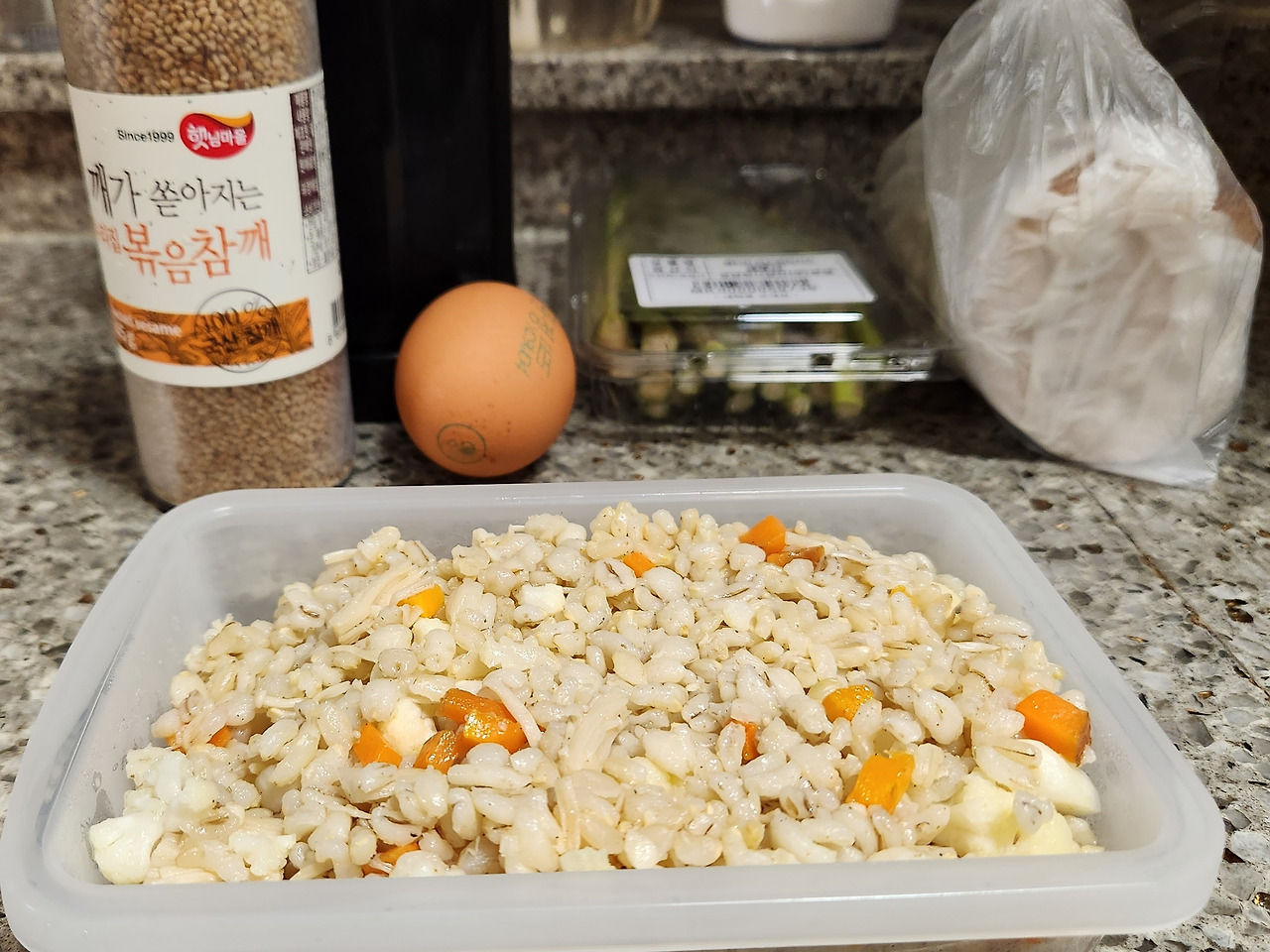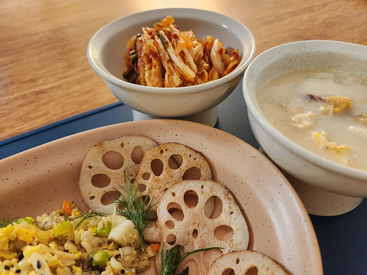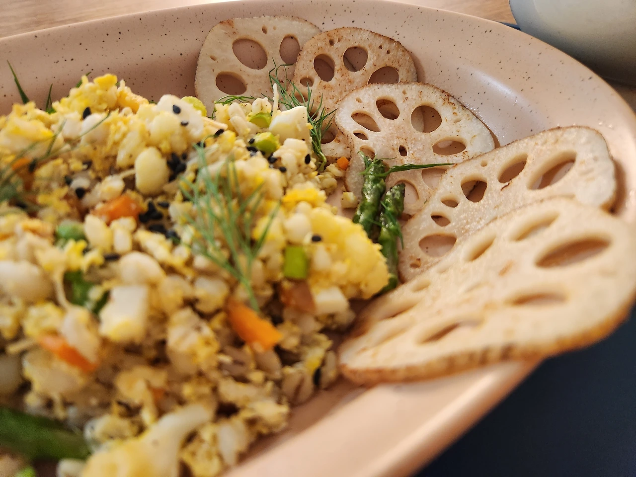 오늘 아침은 10분 정도 늦장을 부린 탓에 새로운 솥밥대신 김치냉장고의 상비 솥밥 중 지난 8일 아침 만들었던 <콜리플라워 당근 팽이버섯 통곡물밥>을 활용하여 마늘향을 입힌 계란 볶음밥을 만들고, 들기름에 구운 고소한 연근구이를 만들어 봤다.