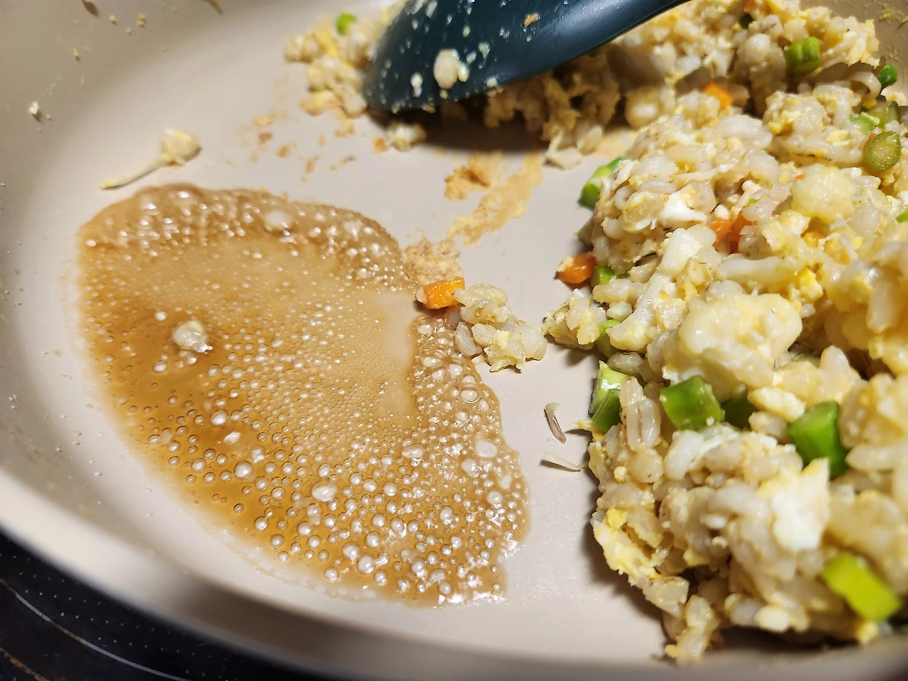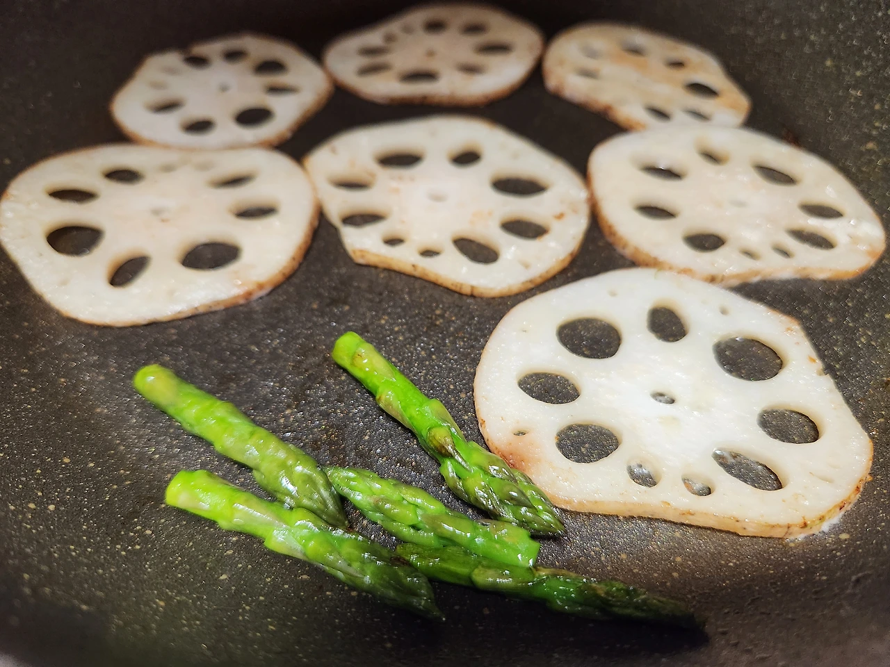 3. 팬 b에 계란 1개를 깨고 밥과 볶아준 후 채 썬 아스파라거스를 넣는다. 팬 b의 빈자리에 국간장 1T를 끓인 후 밥에 간장향을 입힌다. 팬 a에 아스파라거스 윗부분을 넣고 연근과 함께 타지 않도록 뒤집어가며 구워준다.(팬이 작은 탓에 연근 구이는 2번에 나눠 구워줬다.)