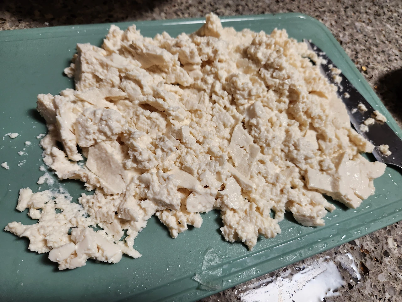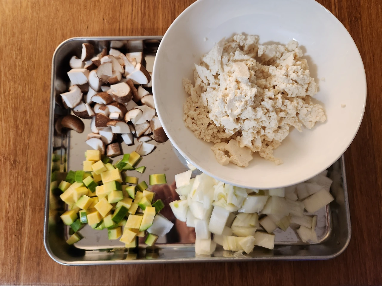 2. 두부를 칼 옆면으로 으깨고 버섯, 애호박, 양파는 우렁살과 비슷하거나 약간 작게 썰어준다.
