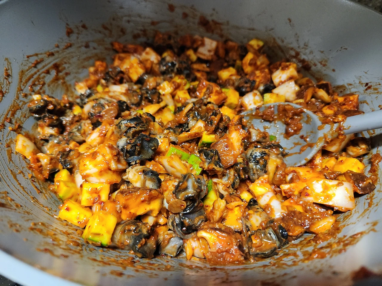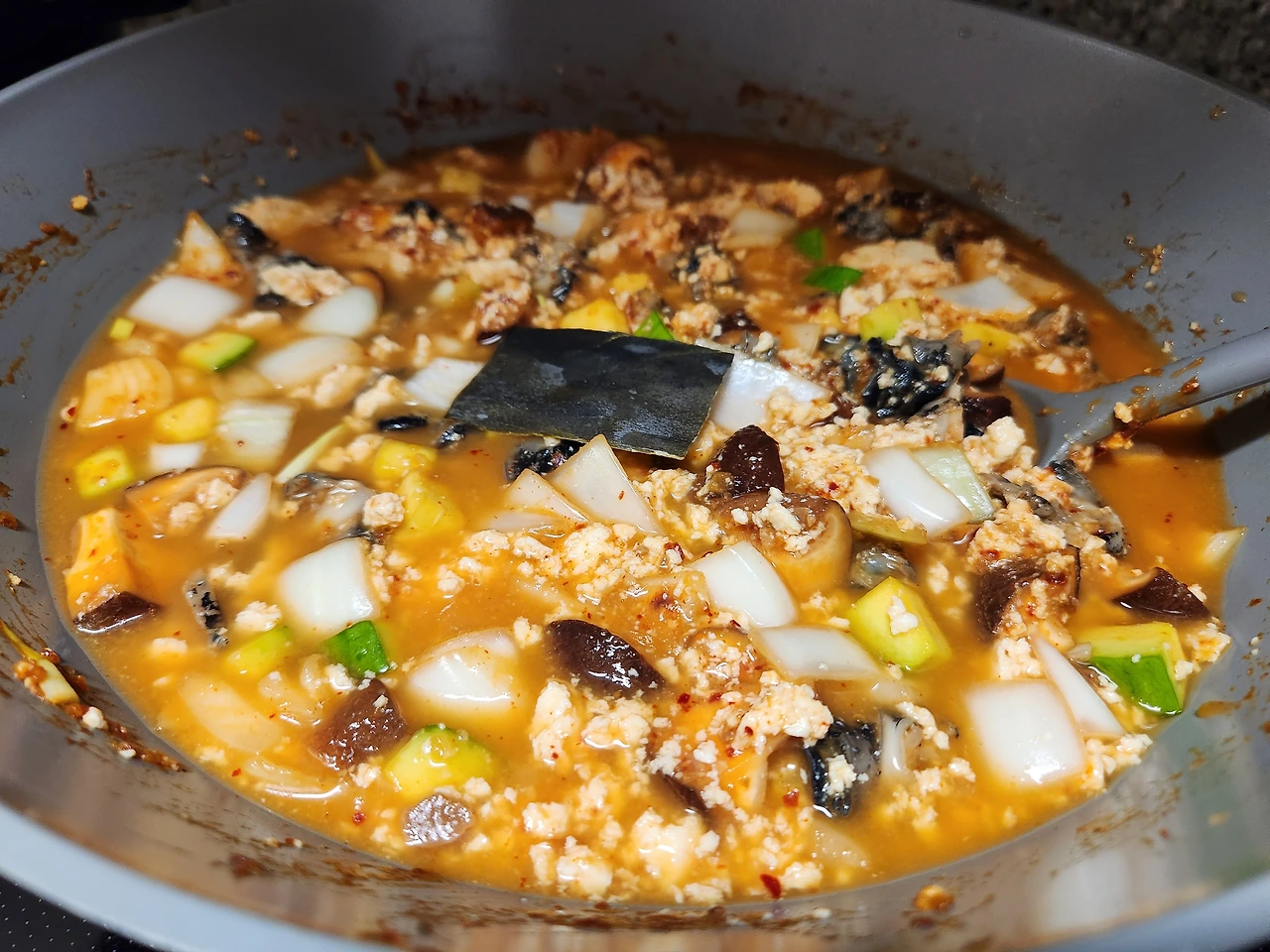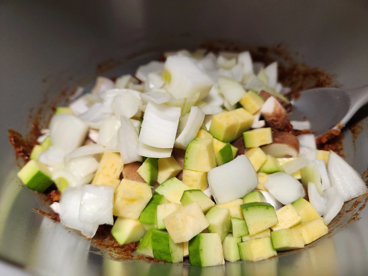 4. 중불에 양념장을 섞은 후 버섯, 애호박, 양파를 넣고 볶아준다.