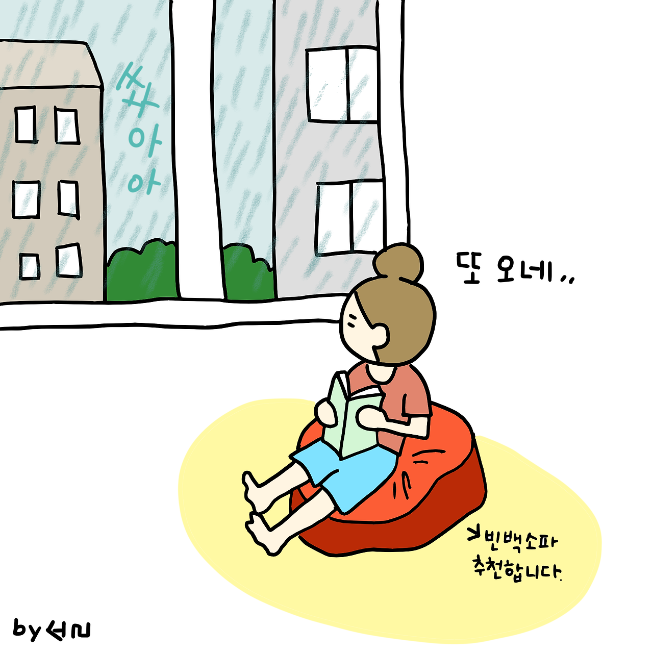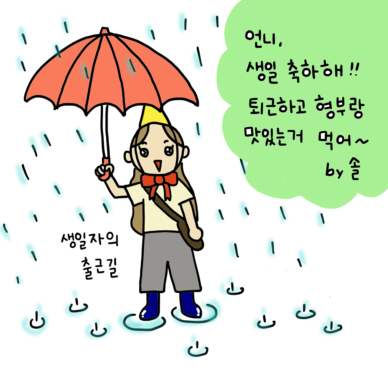오늘은 언니 생일이다. 오전에 비가 오길래 생일인데 출근해야 하는 언니의 안타까운 출근길을 그려보았다. 다행히 언니는 반차를 써서 오후 출근이라 비를 맞지 않고 출근했다고 한다. 언니, 생일 축하해!!