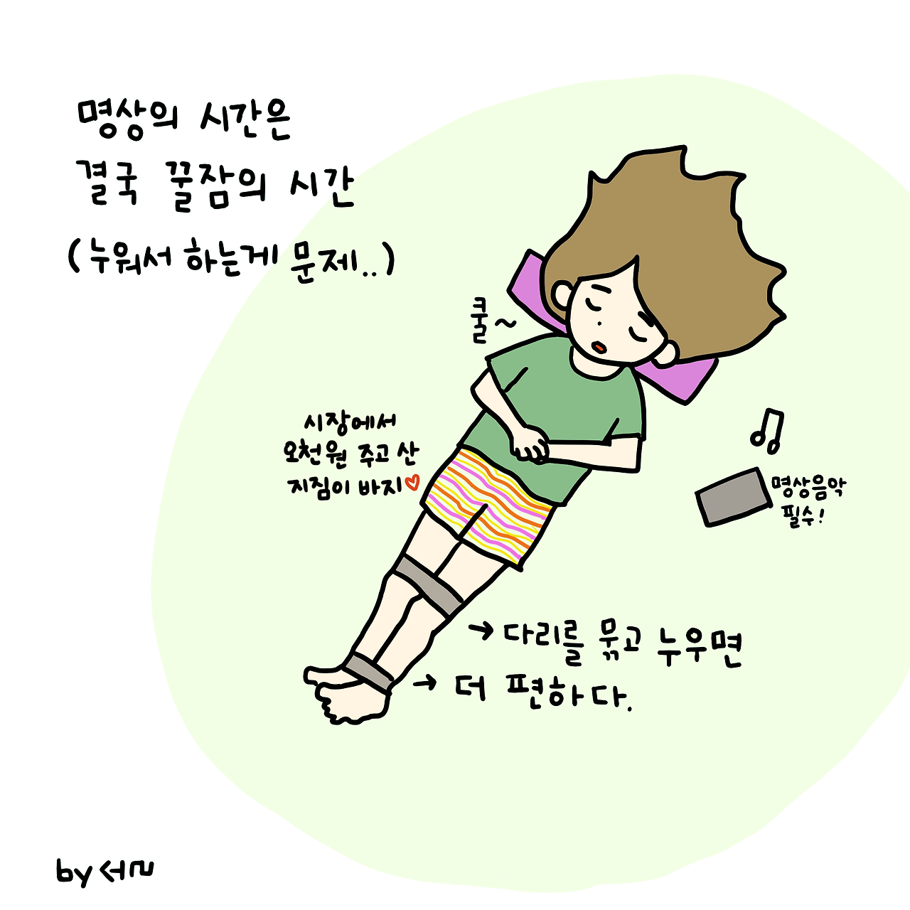 낮잠은 인간의 몸에 꼭 필요한 것이 분명하다. 노곤 노곤한 오후에는 명상 음악을 켜고 바르게 누워서 호흡에 집중한다. 그럼 아주 달콤한 낮잠을 잘 수 있다. 명상은 꿀잠을 자기 위한 디딤돌ㅋㅋ. 단, 너무 길게 자면 밤에 잠이 안 오니 20분 정도 자면 딱 좋다.
