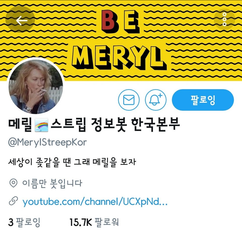 ‘메릴스트립 정보봇 한국본부’(이하 ‘메릴봇’)라는 재밌는 이름의 트위터 계정에는 메릴 스트립과 관련된 다양한 트윗들이 올라온다. 그녀의 훌륭한 연기 영상들뿐만 아니라 많은 인터뷰와 수상 소감 클립들이 게재되어 있다. 팔로워 수는 1만 5천 명. '메릴봇' 계정이 계기가 되어 <마빈의 방>, <더 포스트> 등 영화 상영회를 개최하고 메릴 스트립의 배우 인생에 대한 장문의 글을 기고하기도 했다. '한국본부'라고 부를만 하다.
