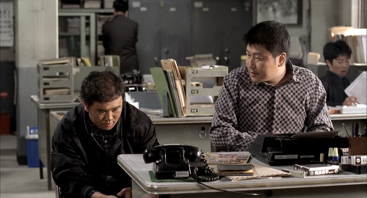 + 또한 이 장면에서는 오브젝트, 즉 소품을 다루는 배우 송강호의 행동선이 두드러지고 있습니다. 타자기를 두드리면서 동시에 주의를 1% 미만으로 두어 담배를 피우는 모습을 확인할 수 있습니다. 이러한 표현은 완전히 무의식적이거나 습관적으로 보일 만큼 자연스럽게 보이며, 그만큼 박두만이라는 형사가 담배와 함께한 시간이 얼마나 길었는지를 알 수 있는 대목입니다. 앞으로도 계속해서 등장하겠지만, 배우 송강호가 소품을 다루는 방식은 이처럼 무의식적이고 습관적으로 느껴지기에 인물이 더욱 사실적으로 느껴지게 만들고 있습니다.