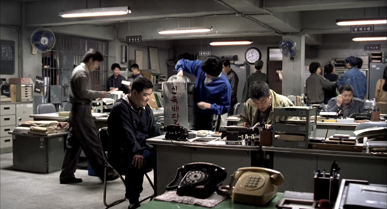 +앞 장면의 담배를 다루는 모습처럼, 배우 송강호는 수저를 손에 들고 배달부를 지적하는 모습, 꾸깃한 영수증을 손으로 훑어 펴는 등 그 물건과 행동에 익숙한 모습을 보여줍니다. 이러한 표현들은 얼마나 오랜 시간 그 물건들이 손에 익었는지를 간접적으로 관객에게 전달해주어 인물에 대한 신뢰도와 매력을 더더욱 높이게 만듭니다.