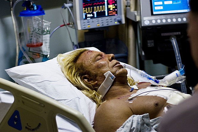 공들여 준비한 경기가 끝을 향해 갈 즈음 극적인 승리의 장면을 위해 그는 손목 붕대에 감춰두었던 면도날로 이마에 상처를 내어 피를 흘린다. 좀 과한 것 아닌가? 생각할 수 있지만 뒤에 이어지는 하드코어 레슬링 경기에 비하면 면도날은 애교수준이다. 스테이플러, 유리, 철사 등등을 이용해, 마치 자신들이 초인이라도 되는 양, 서로의 몸에 상처를 내는 레슬러들의 모습은 가히 충격이다. 피가 낭자한, 말 그대로 하드코어한 경기를 보면서 영화 속 관중들은 환호성을 지르지만 그 장면을 보는 영화 밖 관객들은 충격으로 말을 잃는다. 그리고 이 모든 것을 감당하기에 역부족인 노장 랜디를 보고 있으면 그의 육체적 고통이 화면을 뚫고 전달되는 것만 같아 괴롭다. 경기가 끝나고 랜디는 쓰러진다. 의사는 당장 약물을 끊고 과격한 운동을 그만두지 않으면 심장이 더 이상 견디지 못할 거라고 경고하지만 그가 결정적으로 은퇴를 결심하게 된 것은 간단한 조깅조차 감당할 수 없는 몸 상태와 초라한 사인회 자리에서 마주한 전직 레슬러들의 망가진 몸(휠체어, 목발에 의존하고 있는) 때문이다.