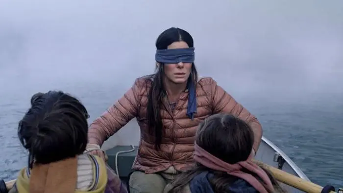 <더 로드>에서와 마찬가지로 <버드 박스>에서 생존자들을 위협하는 것은 또 다른 생존자들이다. 두 아이와 함께 길을 떠나는 맬린다는 아이들에게 당부하고 또 당부한다. ‘안대를 벗지 말 것! 절대로 다른 목소리를 듣지 말 것!’ 타인과의 접촉이 공포가 되어버린 잔혹한 현실에서 붙잡는 희망의 끈은 위태롭다. 눈을 뜨고 보라는 유혹의 목소리들. 도대체 무엇을 보라는 것일까? 도대체 그들이 보는 무엇이 스스로 목숨을 끊게 만드는 것일까?