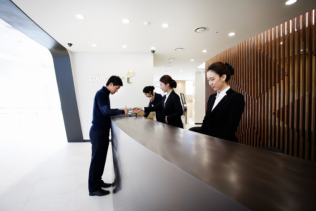 2. 프런트 등록: 정문 앞에서 본인의 보스턴백을 찾아 들고 건물로 들어가 프런트로 갑니다. 안내하는 직원분에게 티오프 시간과 예약자 명을 말씀하세요. 그럼 그 분이 락커룸 번호가 적힌 종이를 줄 거예요.(키오스크로 셀프 체크인을 하는 경우도 있고, 이름을 종이에 직접 적는 경우도 있는데... 그건 눈치껏 샤샤샥 ㅎㅎㅎ)