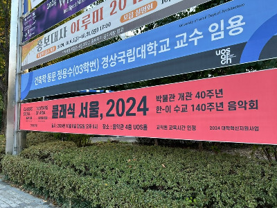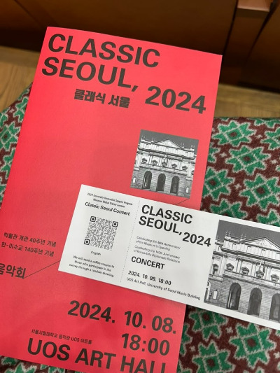 서울시립대학교에서 근무하는 동생이 학교 이메일 확인을 뒤늦게 했는데 오늘 저녁에 대학내 박물관 개관 40주년 기념 음악회 초대장을 받았으니 얼른 오라고 연락이 왔다. 아니 갑자기? 서둘러 집에서 나와 해가 지는 예쁜 하늘을 뒤로한 채 아기자기한 캠퍼스에 도착했다.
