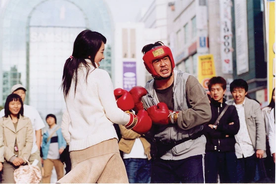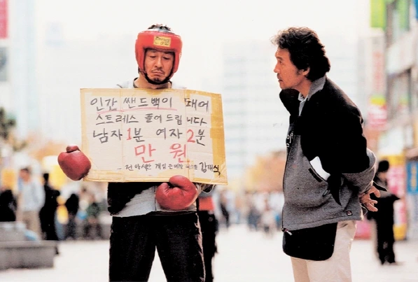 첫 장면부터 관객들을 무척 심란하게 할 뿐 아니라 내용이 진행될수록 보는 이의 마음을 퍽도 아프게 만드는 이 영화는, 운동복과 권투화를 어깨에 메고 터덜터덜 길을 걷던 한 중년 남성이 뒷골목 모퉁이에서 옷을 갈아 입은 뒤 번화한 길 구석에 앉아 우유 한 팩을 마시는 장면으로 시작됩니다. 사람들이 분주히 오가는 거리 복판에서 덥석 큰절을 한 그는 메가폰을 입에 대고 자신을 “1990년 북경 아시안게임 은메달리스트, 강태식”이라고 소개하며, 여러분들(장사 안돼 짜증나는 사장님, 떼인 돈 못 받아 잠 안 오는 사모님, 애인한테 버림 받은 언니 오빠)의 울분과 스트레스를 한 방에 날릴 수 있도록 자신이 돈 ‘만원’에 “인간 샌드백”이 되어 주겠다고 광고합니다. 화면이 바뀌어 다른 쪽을 비추면 고급 차량의 오디오를 훔쳐 들고 나오려다 경찰에 발각되자 오토바이로 도주전을 펼치는 한 젊은 남성이 등장하지요. 그 자리에서는 운 좋게 경찰을 따돌렸지만 친구를 돕겠다고 패싸움을 벌이다가 결국 경찰에 체포된 그는, 소식을 듣고 달려온 아버지의 손에 이끌려 경찰서 문을 나섭니다.