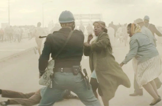 1965년 2월, 찬송가를 부르며 비폭력 시위를 벌이던 흑인 주민 500 명을 상대로 무력 진압을 강행한 주 경찰이 17세 소년 “지미 리 잭슨(Jimmie Lee Jackson)”을 사살하는 사태가 발생하자 한 달 후인 3월 7일 목사인 “제임스 베블(James Bevel)”의 주도로 600 명의 사람들이 셀마에서 몽고메리까지 행진하는 시위를 벌입니다. 하지만 몽고메리에 다다르기 위해 건너야 하는 에드먼드 페터스 다리 끝에서 무장 상태로 기다리고 있던 병력은 자신들의 해산 명령에 순응해 곧바로 후퇴를 시작한 민간인들에게 최루가스를 분사한 후 자신들은 방독면을 쓰고 뒤쫓아가 경악스런 폭력을 행사하지요. 이 행진에 대한 여론의 관심으로 CBS 뉴스에서 생중계 중이던 방송을 통해 7,000만 명의 시청자가 그 끔찍한 장면을 목도하는데, 현장에서 ‘구경’하던 100여 명을 포함한 백인들 가운데에는 소리치고 ‘응원’하며 더하라고 부추기는 사람들이 있는 반면 차마 눈을 뜨고 똑바로 보지 못한 채 흐느끼는 사람들 역시 적지 않았습니다. 이 참상 속에서 곤봉과 채찍으로 가격 당해 골절이나 두개골 손상을 입은 부상자가 속출하는, 말 그대로 “피의 일요일”이라 불릴 만한 상황이 발생하게 된 것입니다.