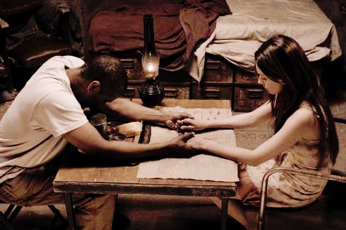 물을 구하기 위해 한 주점에 들어갔던 일라이는 마을의 폭력배 일당과 원치 않는 시비에 휘말리는데, 그 과정에서 놀라운 솜씨로 열 명 이상의 불량배를 혼자 처치하는 일라이의 실력을 목격한 카네기가 그의 범상치 않음을 직감하면서 성경을 찾는 일에 큰 역할을 할 수 있을 듯한 그를 휘하에 두고자 ‘공’을 들이기 시작합니다. 자신의 호의를 거절하는 그에게 하룻밤 묵어 갈 것을 권하며 물과 음식을 풍족하게 대접하는 것으로도 모자라 정부(情婦)인 “클로디아(Claudia)”의 딸 “솔라라(Solara)”를 일라이가 머무는 방에 들여 보내면서까지 그의 마음을 돌리려 애쓰는 것이지요. 하지만 솔라라와의 동침을 거부하고 그녀를 그대로 내보려던 일라이는 카네기의 처벌을 두려워하는 솔라라가 방에 머물게 해 달라며 사정하자 자신에게 주어진 음식을 나누어 먹으면서 그녀에게 식사 기도를 가르쳐 줍니다.