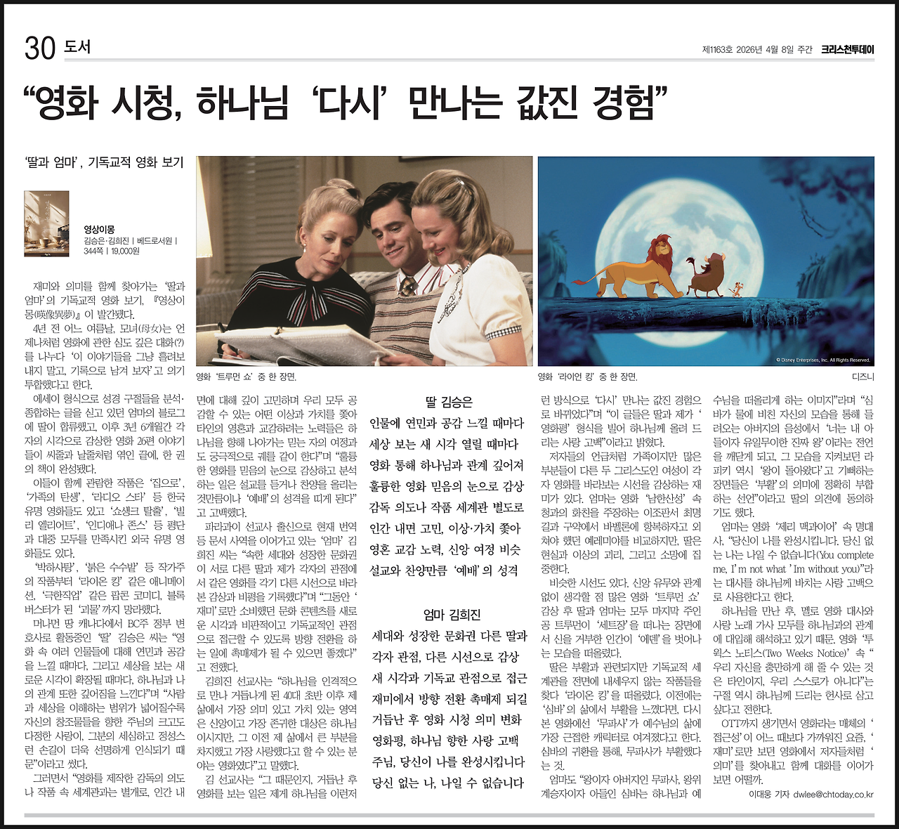 저와 엄마가 쓴 영화 비평서 “영상이몽(映像異夢)”을 소개하는 기사가 올라 공유합니다.