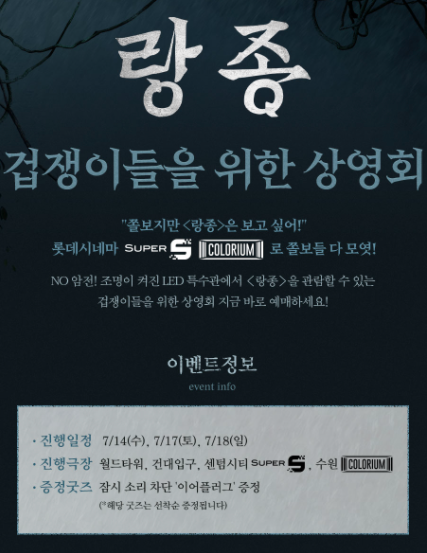 그리고 여기, 관객의 '니즈'를 제대로 파악한 시사회가 있다고 하는데요. 그 주인공은 바로! 7월 14일 개봉하는 화제의 영화 <랑종>입니다. 극강의 쫄깃함을 선사했던 영화 <곡성>을 '코미디' 영화라 일컬은 '나홍진 감독'이 공포 영화라 말한 <랑종>은 그 어느 곳에서도 느낄 수 없던 공포를 선사할 예정이라 하는데요. 때문에, 영화를 좋아하는 쫄보들 사이에서 보고 싶지만 볼 수 없는 영화로 아쉬움을 안겨주기도 했습니다 관객들의 이런 애타는 마음을 읽었을까요? 영화 <랑종>이 쫄보들을 위한 '겁쟁이 상영회'를 연다고 하는데요. 어두워야만 상영이 가능한 여타 상영관과는 달리, TV와 같은 LED 스크린을 보유한 수퍼S관과 컬러리움관에서 진행되는 본 시사회는 불을 켠 채 진행된다고 합니다! 극장이 보유한 특수관의 이점까지 결합시킨 이 상영회에서 '겁쟁이'들을 위해 소음 차단 이어플러그까지 받을 수 있다고 하니, 저부터 달려가 봐야 할 것 같습니다...