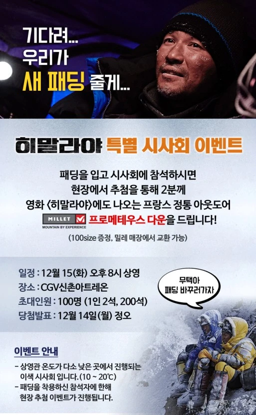 황정민 주연의 영화 <히말라야>는 체감상 영화 속 '히말라야'보다 더 추웠던 2015년 12월에 개봉되었는데요. 개봉 하루 전, 그 추위를 배가시키는 시사회를 개최하여 화제를 모았습니다! <히말라야>의 위대한 도전에 걸맞는 본 시사회는 난방이 꺼진 한겨울 극장에서 개최되었는데요. 게다가, '패딩'을 입고 참석한 관객을 대상으로 추첨을 통해 영화에 나온 황정민 패딩을 증정하는 경품 행사까지 진행했다고 합니다. 하지만, <히말라야> 하면 역시, 포스터로 황정민과 싱크 100% 되어보기 가 최고의 홍보였죠!