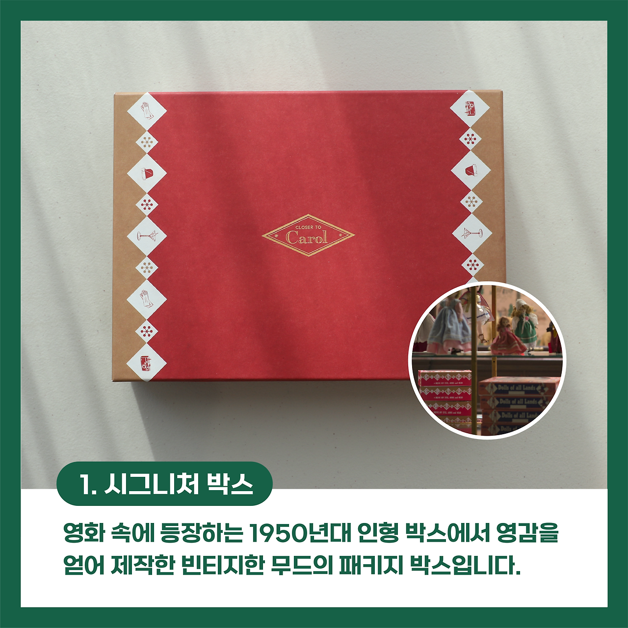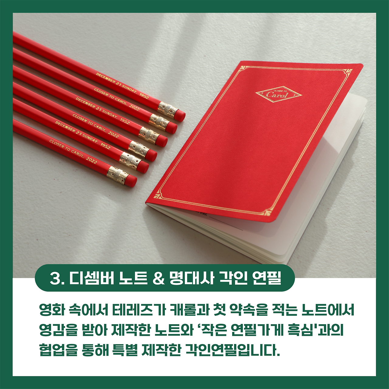 [클로저] 팀에게 <캐롤>은 선물 같은 작품이라고 해요. 좋아하는 영화 속 장면들을 선물하고 싶은 마음에서 갖고 싶은 물건들을 만들고 싶었으니까요. [클로저 투 캐롤]은 클로저 팀의 이러한 마음을 듬뿍 담아서 구성품 하나하나가 소중하고 특별하답니다. 영화 <캐롤>의 팬이라면 누구나 소장하고 싶을 상품들을 지금 바로 소개해 드릴게요.