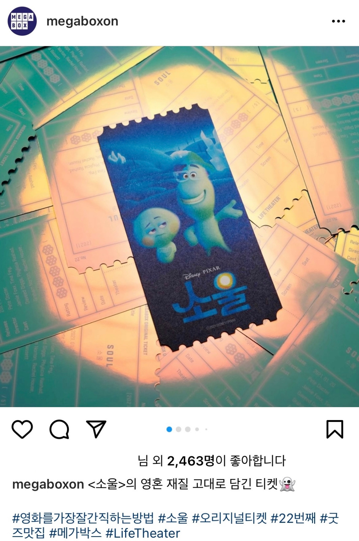 다만 지급 대상이 <소울>의 당일 관람 티켓을 소지한 메가박스 멤버십 회원으로 한정되어 있는데요, 먼저 메가박스 멤버십에 가입 후 <소울>을 예매하고, 관람 당일 매표소 방문 후 종이 티켓을 발급하면 종이 티켓 관람 인원수만큼 오리지널 티켓을 수령하실 수 있습니다.