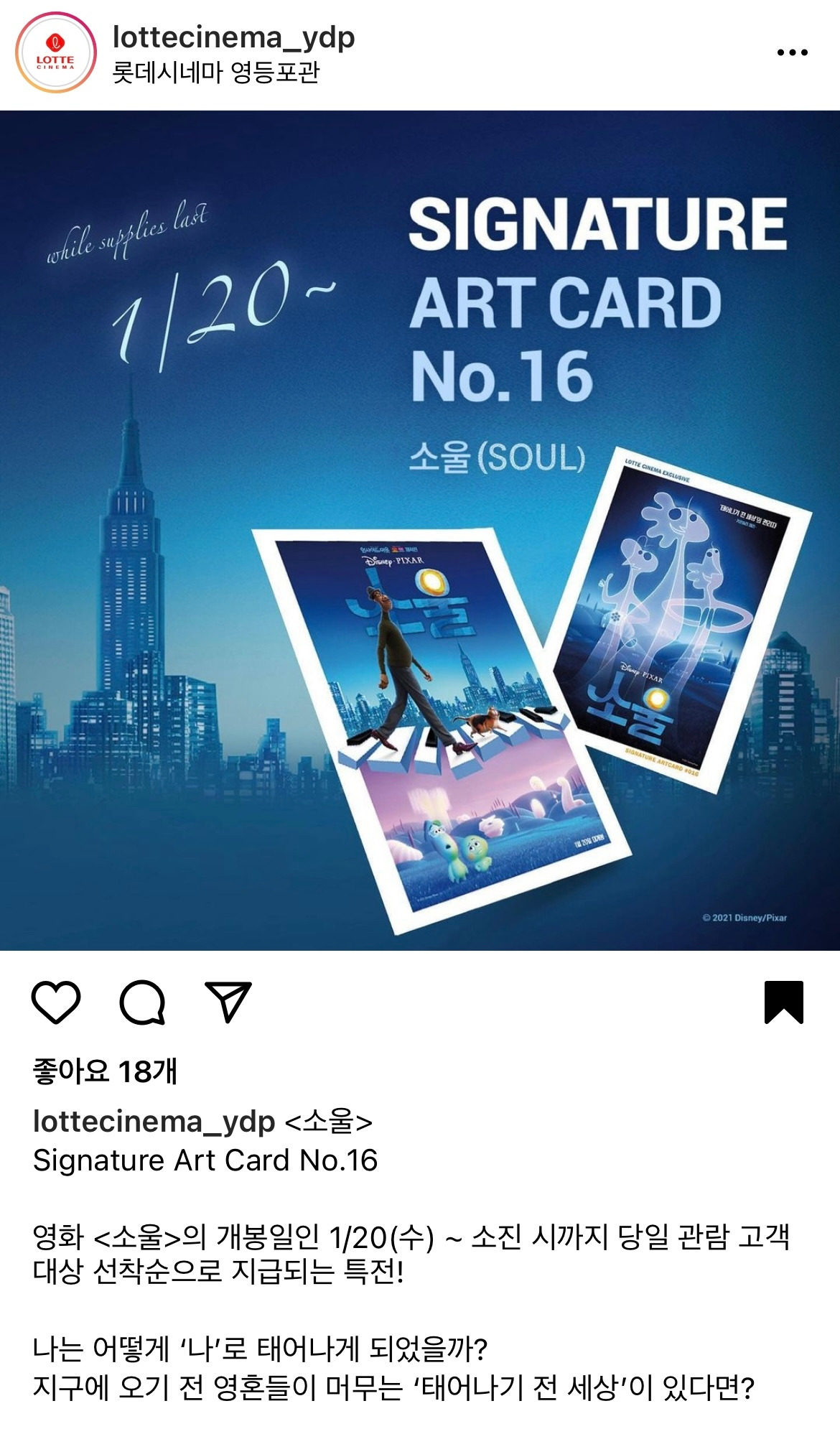 롯데시네마에서는 시그니처 아트카드를 증정합니다. 이벤트는 역시 2021.01.20 (수)부터 수량 소진 시까지 진행되며, <소울> 당일 관람 티켓을 매표소에서 인증하시면 선착순으로 경품을 증정받으실 수 있습니다. 이벤트 진행 지점은 롯데시네마 홈페이지 (https://event.lottecinema.co.kr/NLCHS/Event/EventTemplateInfo?eventId=201010014221002)에서 확인 가능합니다.