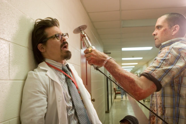 영화는 이후 마음을 다잡은 체리가 레이와 함께 생존자 무리를 이끌며 안전 지대로 도망치는 과정을 박진감 있고 코믹하게 다룬다. 톡톡 튀는 B급 감성으로 사랑받는 로버트 로드리게즈 감독(‘씬 시티’, ‘알리타:배틀 엔젤’ 등 연출)은 이 작품에서도 ‘싼티’를 자기 의도대로 능수능란하게 활용하는 신공을 보여준다. 좀비에 의한 살육 장면이 그렇다. 실감 나게 표현하는 대신 ‘이거 다 분장이야’라고 외치는 듯한 뻔뻔함이 느껴진다. 후반부엔 체리가 절단된 다리에 기관총을 장착해 인간 병기로 거듭난다. 물리적으로 도저히 불가능해 보이는 구조이지만, 앞쪽에 B급 감성을 충분히 깔아 둔 덕에 ‘그러려니’ 하고 넘어가게 되는 효과가 있다.
