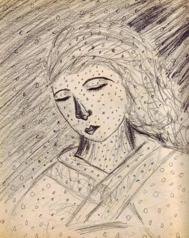 위의 그림은 쿠사마 야요이가 10살 때 그린 어머니의 초상화로 그 당시 쿠사마가 보고 있던 세상의 모습을 잘 보여준다. 후에 그녀가 말하길 어머니가 미워 그녀가 물거품처럼 사라지길 바라는 마음이 투영된 그림이라고 설명했다.