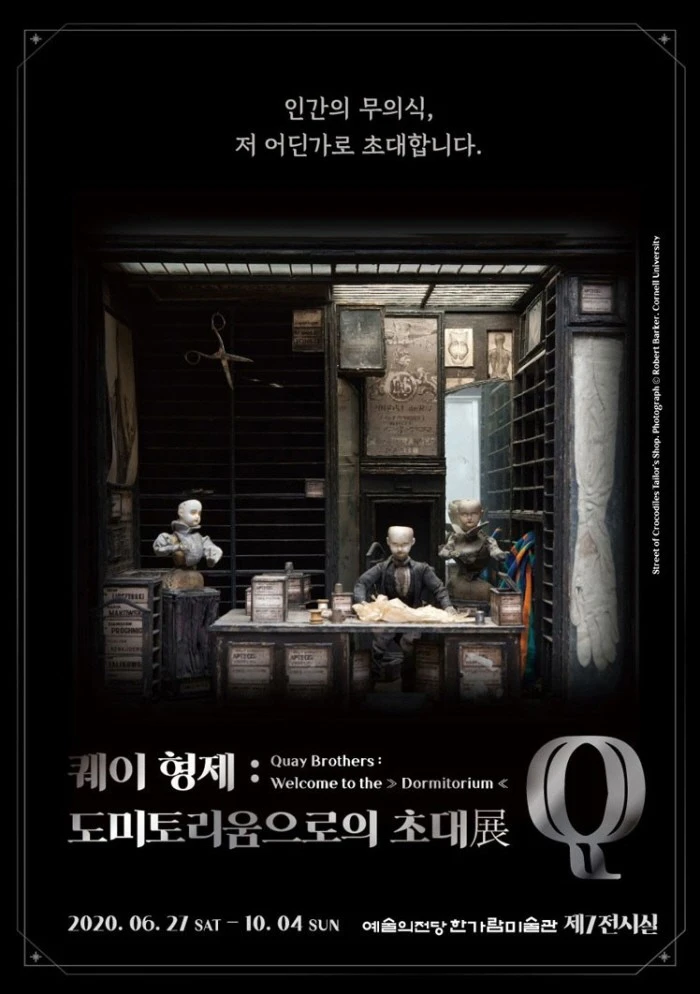 최근 예술의 전당에서 열린 퍼핏 애니메이션(puppet animation)의 대가, 퀘이 형제(Brothers Quay)의 전시회 <도미토리움의 초대>를 보고 왔다. 여기서 퍼핏 애니메이션이라는 명칭이 생소할 수 있다. 간단하게 설명하면 인형을 조금씩 움직여 한 장면씩 촬영하여 움직임을 만드는 스톱 모션 애니메이션이라고 할 수 있다. 그러나 그것을 넘어서 움직이는 피사체인 인형뿐만 아니라 인형이 움직이는 공간의 제작까지도 세심한 심혈을 기울인 종합예술이다.