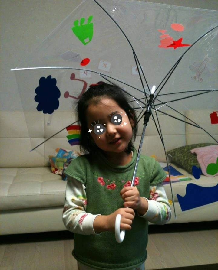 투명 비닐우산은 아이가 특히 좋아하는 놀이였는데, 비싸지 않은 아동용 비닐우산을 사두면 여러모로 유용하다. 가위질이 어려울 때는 매직을 이용해서 그림을 그리고, 가위질이 가능한 연령일 때는 매직에 시트지를 추가해서 나만의 우산을 만든다. 세상에 하나뿐인 우산을 만들어두면 비 오는 날 아이의 등굣길이 즐거워진다. 또 친구의 생일 선물로도 아주 좋다.