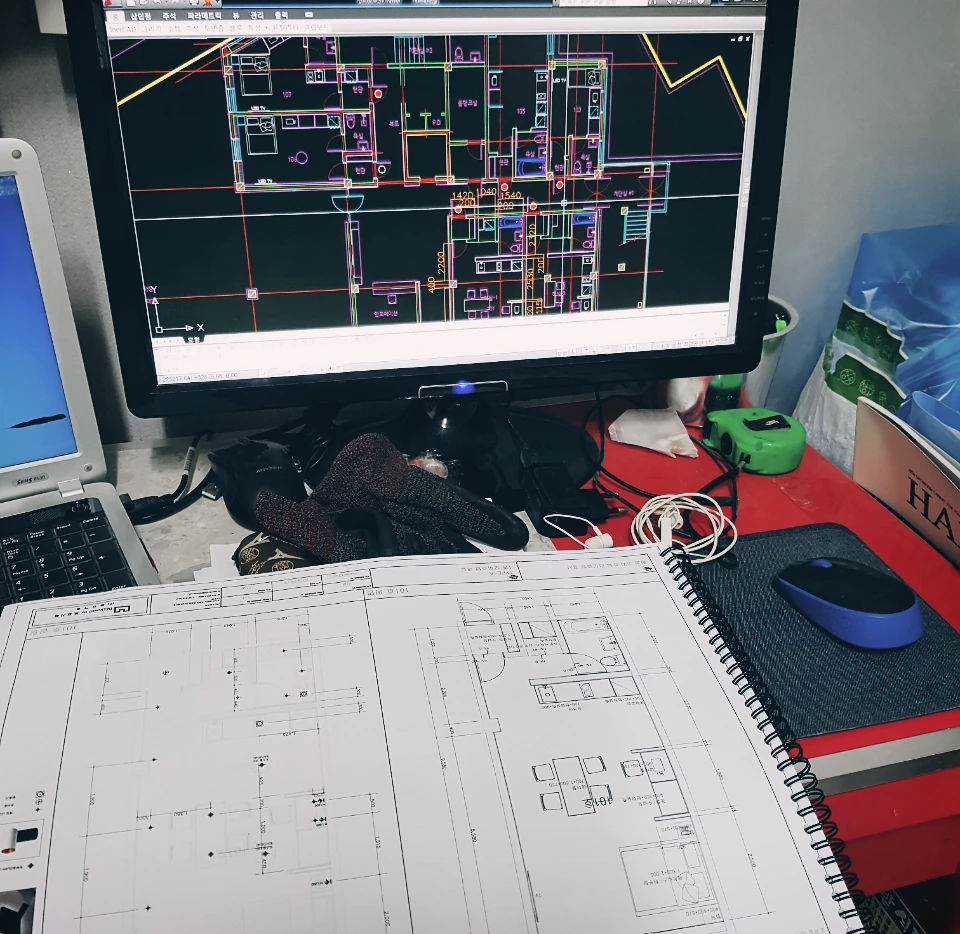 도면과 현장 서류 수정으로 책상 앞에만 앉아있다 오는 날은 슬리퍼 신고 올 걸 그랬다며 후회한다.