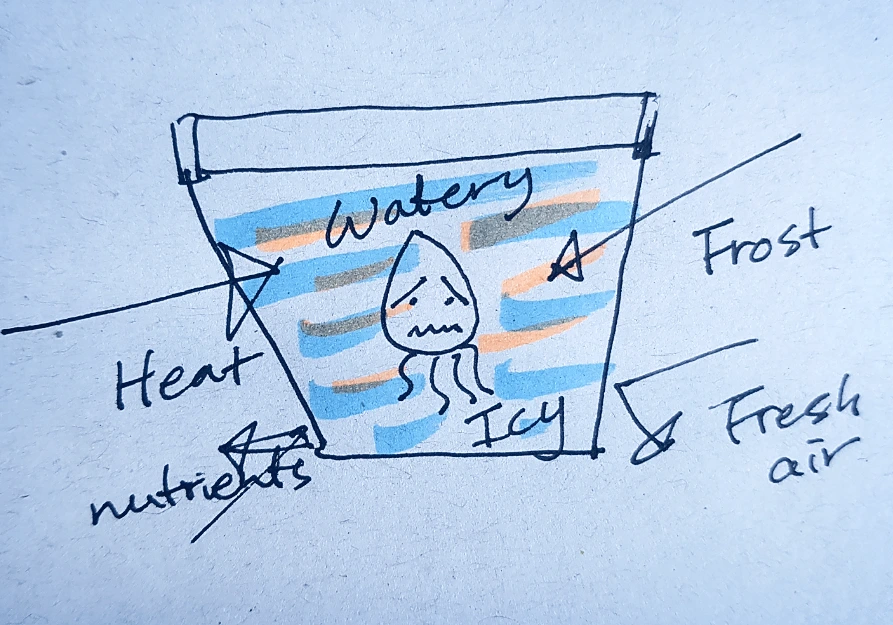 만약 화분 채 그대로 밖에 내놓는 다면 겨울철 배수가 여의치 않으며 온도 변화에 취약하고 공기조차 잘 통하지 않는 데다 미처 빠져나가지 못한 물이 얼면서 구근을 짓누르거나 구근 내의 수분이 팽창하며 냉해를 입게 된다.