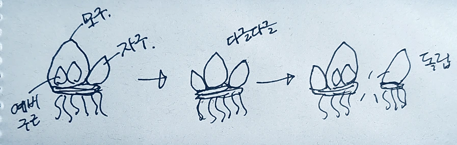 모구와 자구는 생장판에 서로 연결된 채로 영양을 공유하며 일정 기간이 지나 자구가 충분히 성장하면 자연스럽게 모구가 소멸되며 자구들끼리 서로 생장판을 나눠가진 채 각각의 개체로 나누어진다.