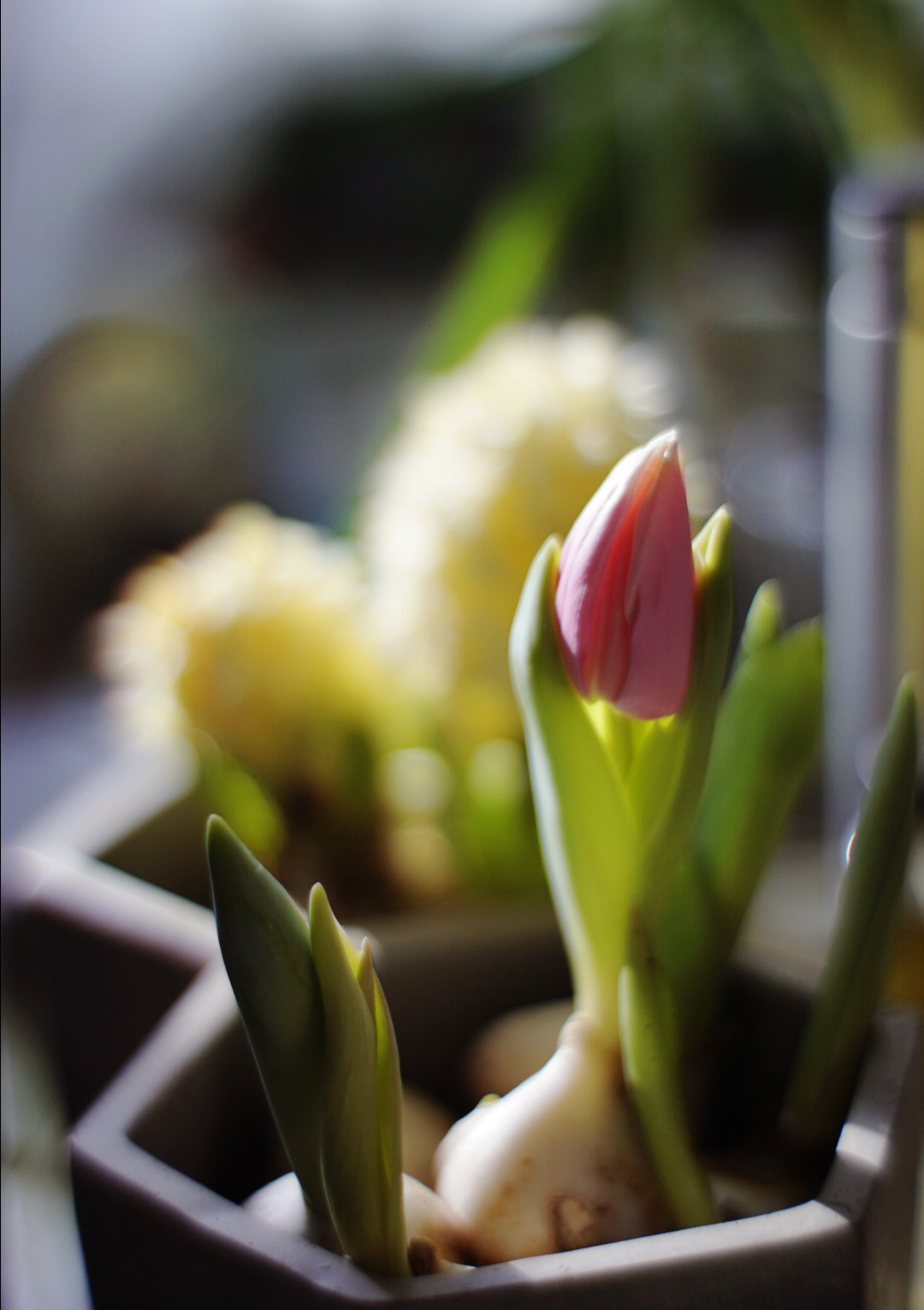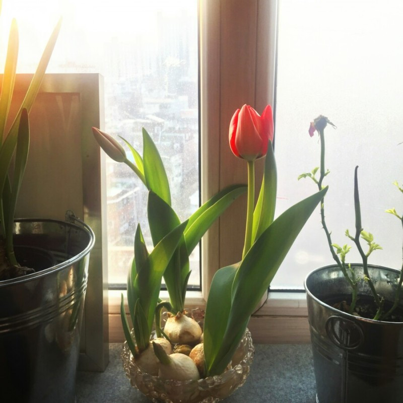 지금 내가 살고 있는 집은 창이 정남향으로 나있는데 가끔 수경재배 중인 튤립 수분의 물이 따뜻하게 느껴질 때가 있다.
