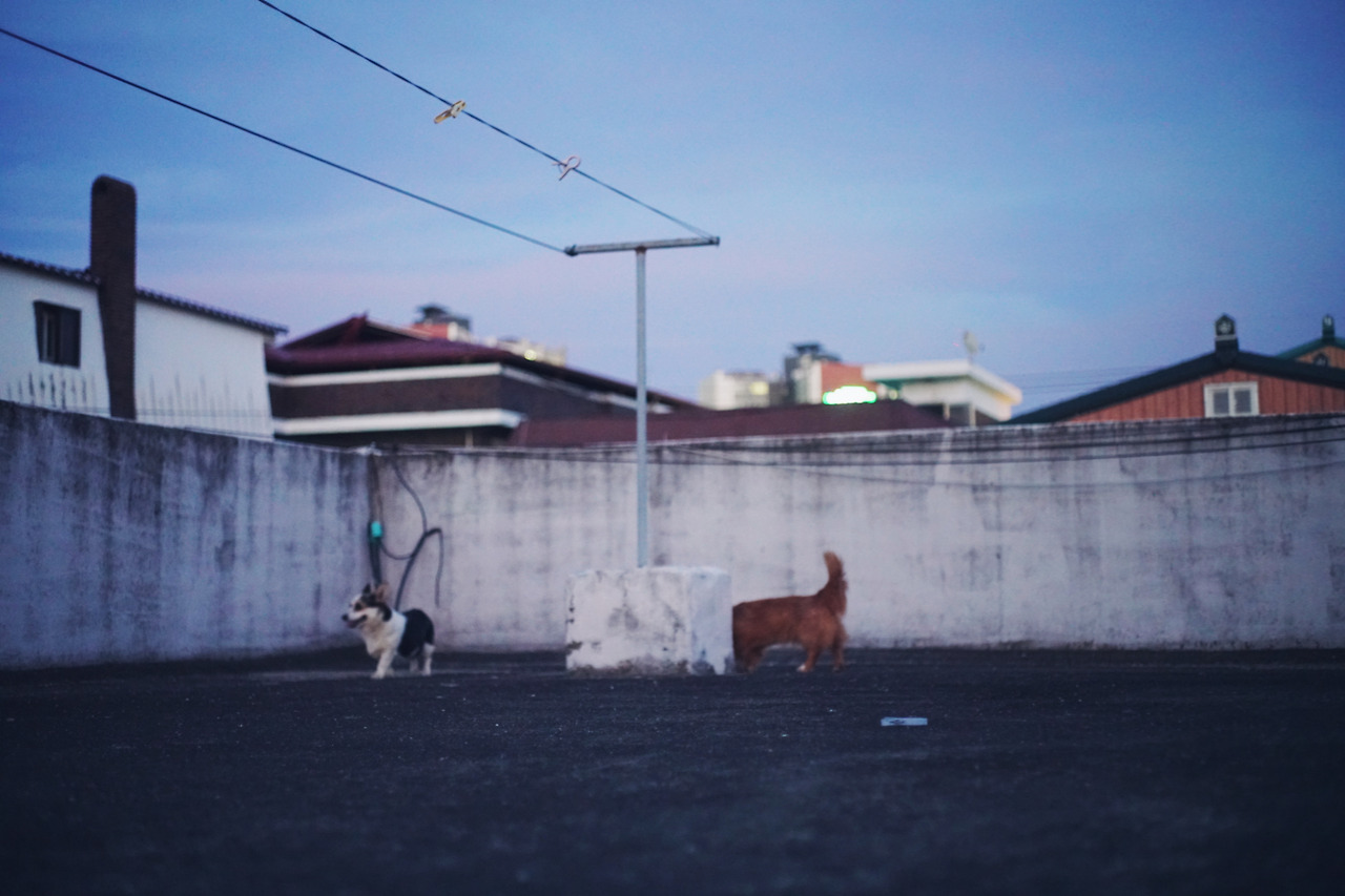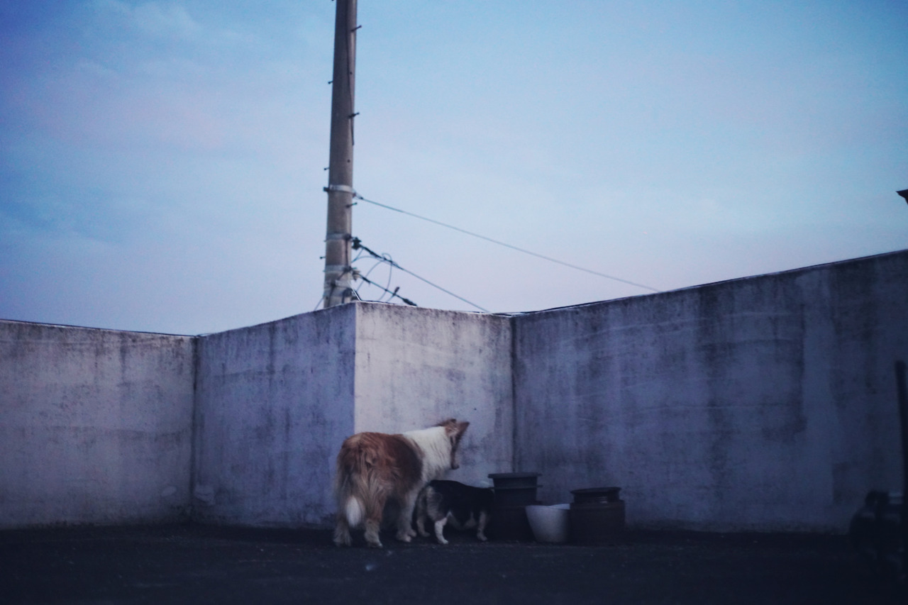 며칠 동안 농장에 데려가지 못한 저녁에 갑갑해하는 개들을 임시방편으로 옥상에 데려갔다.