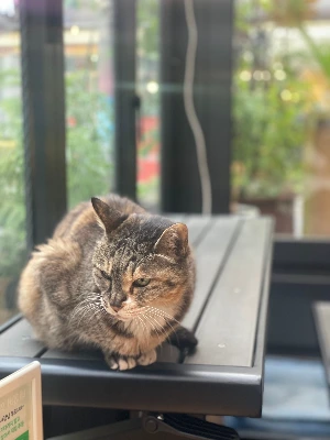 5분쯤 지났을까? 주문을 마치고 자리에 앉아있는데 내 왼쪽 허벅지에 무언가 스윽, 하고 스치는 게 느껴졌어. 묘기척에 고개를 돌려보니, 정체는 자그마한 고양이. 내가 의자 옆에 올려뒀던 노트북 커버 위에 쭈그려 앉아있더라. 장묘정신 가득한 표정으로 식빵을 굽고 있는 그 자태는 말해 뭐 해.