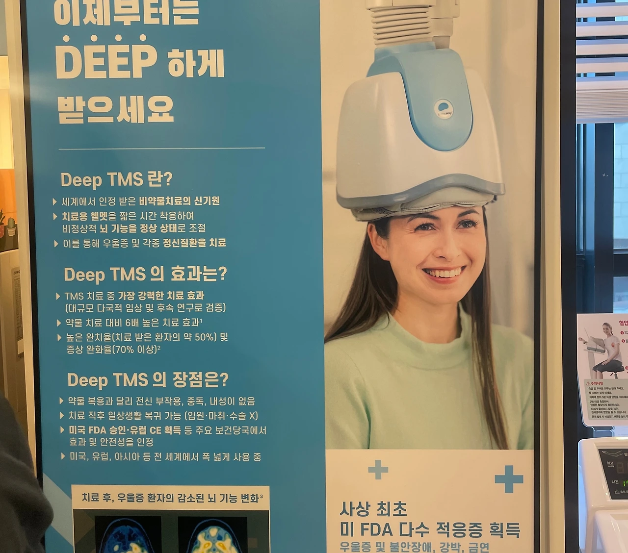 약물은 3주는 지나야 효과가 제대로 나타나기 시작한다고 한다. 그래서 우울증도 일단 약물로 최대한 막아보다가, 3주 뒤에도 차도가 없으면 다른 치료를 병행하기로 했다. 이 치료는 뇌파치료와 일면 맥을 같이 하는데, 정식 명칭은 TMS(Transcranial Magnetic Stimulation)이고 전두엽에 자극을 주는 전형적 우울증 치료법이다. 이 또한 그 뭐시기(?) 비침습적 치료라고 하는데 역시나 잘 모르겠다.... 어쨌든 우울증 완화에 있어 탁월한 효과를 보여 대학병원에서도 많이들 권하는 방법이라 들었다.